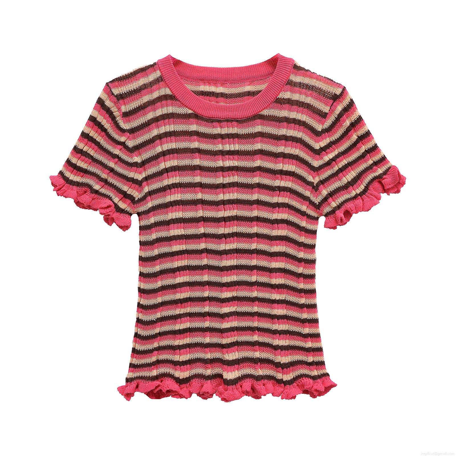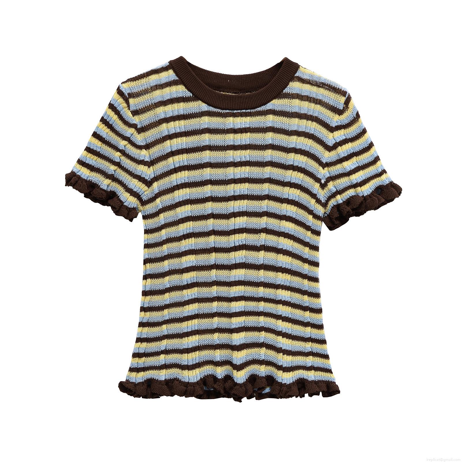 Women's Striped Knit T-Shirt Mercerized Cotton Ruffle Hem Short Sleeve Round Neck Loose Casual Streetwear Tops