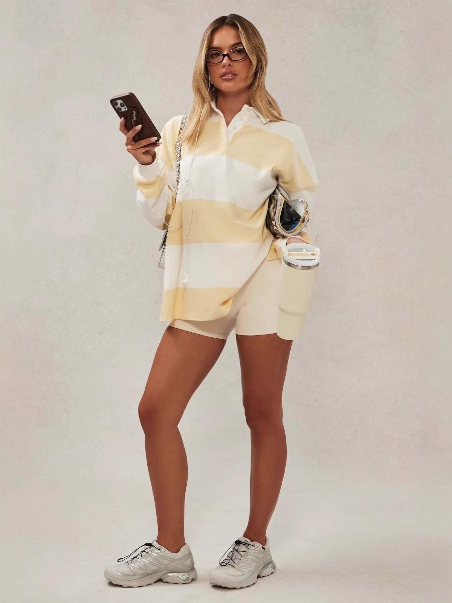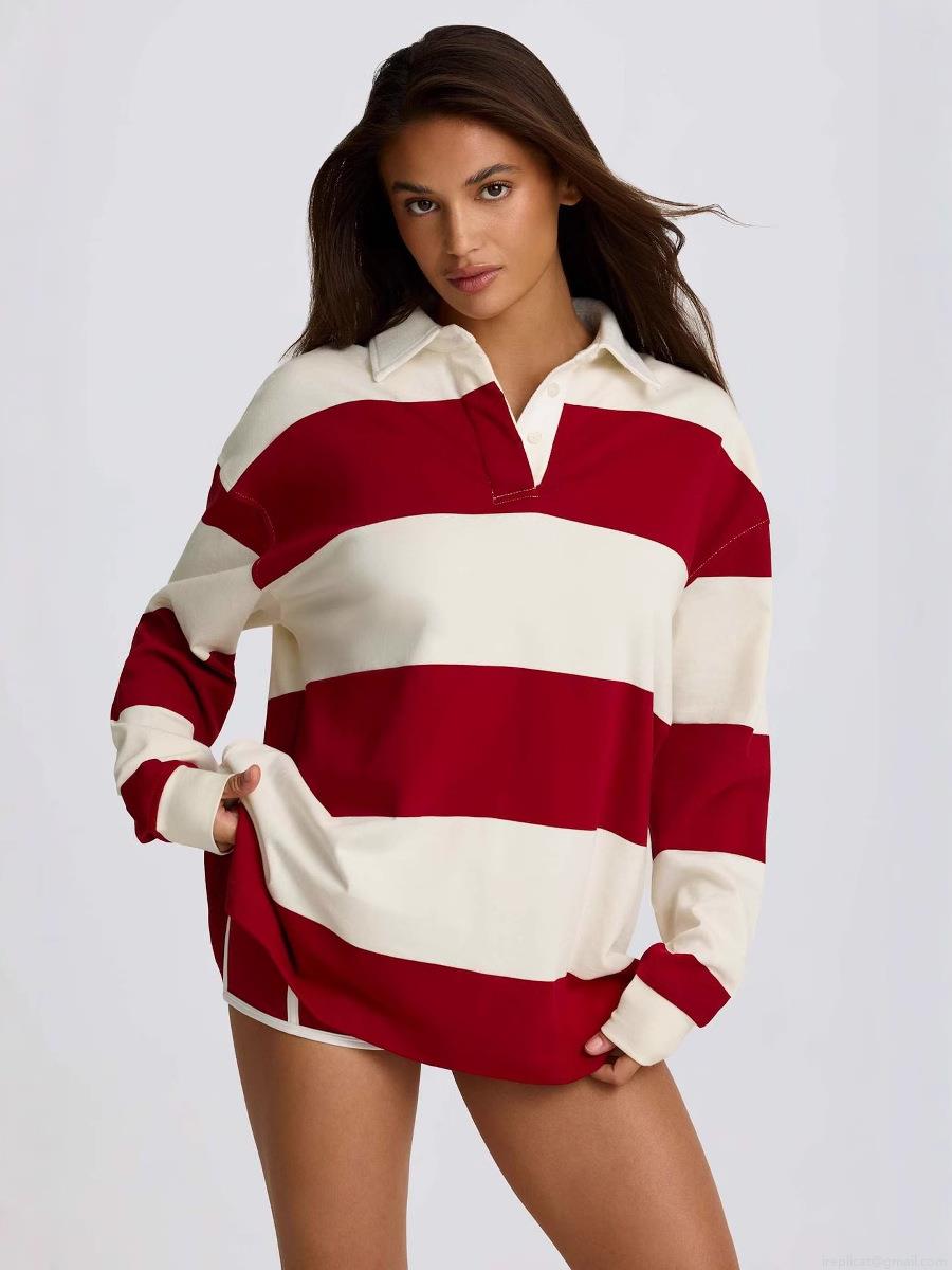 • Women's Striped Long Sleeve Polo Shirt Retro Combed Cotton Rugby Top Casual Oversized Lapel Knit Sweatshirt For Spring Autumn Fashion