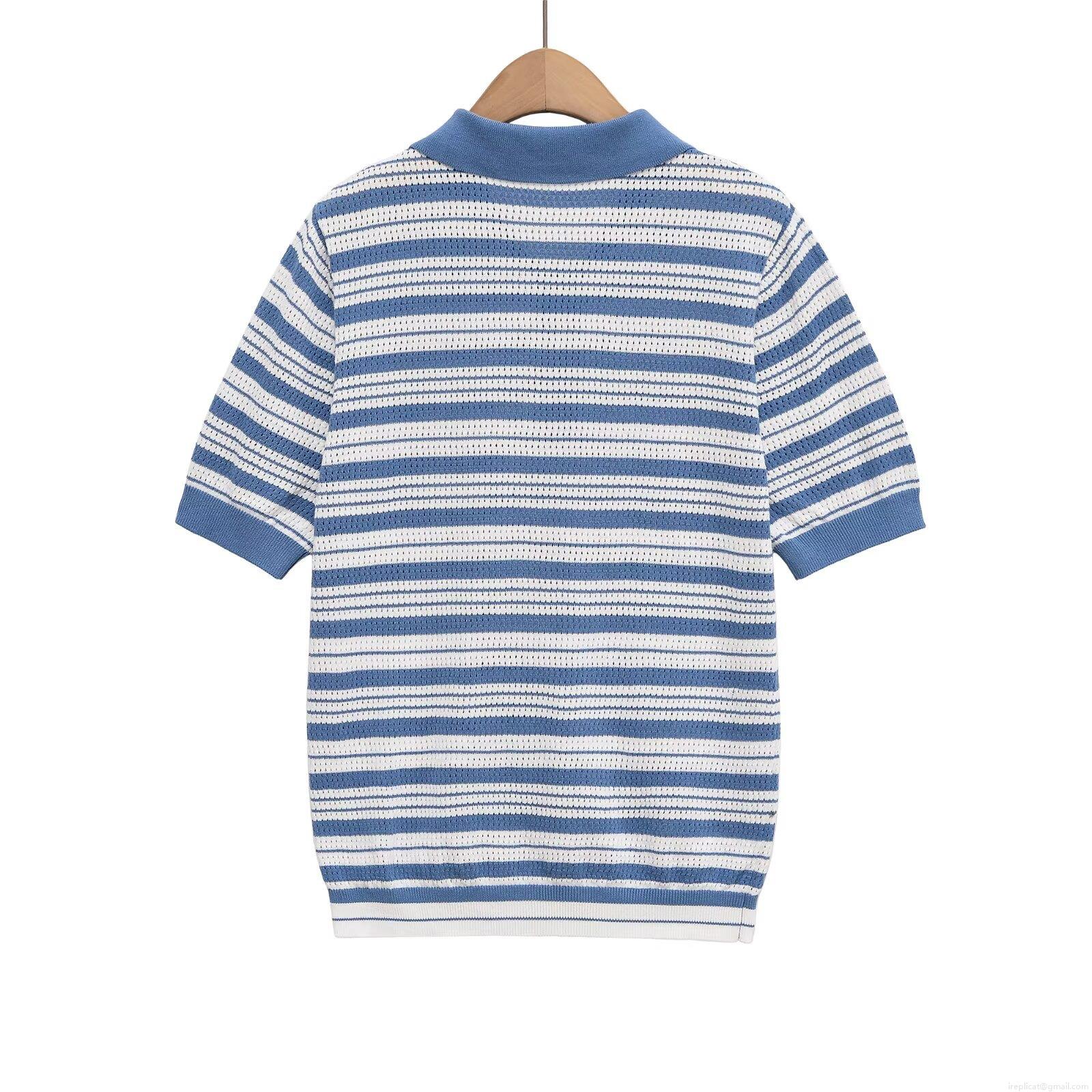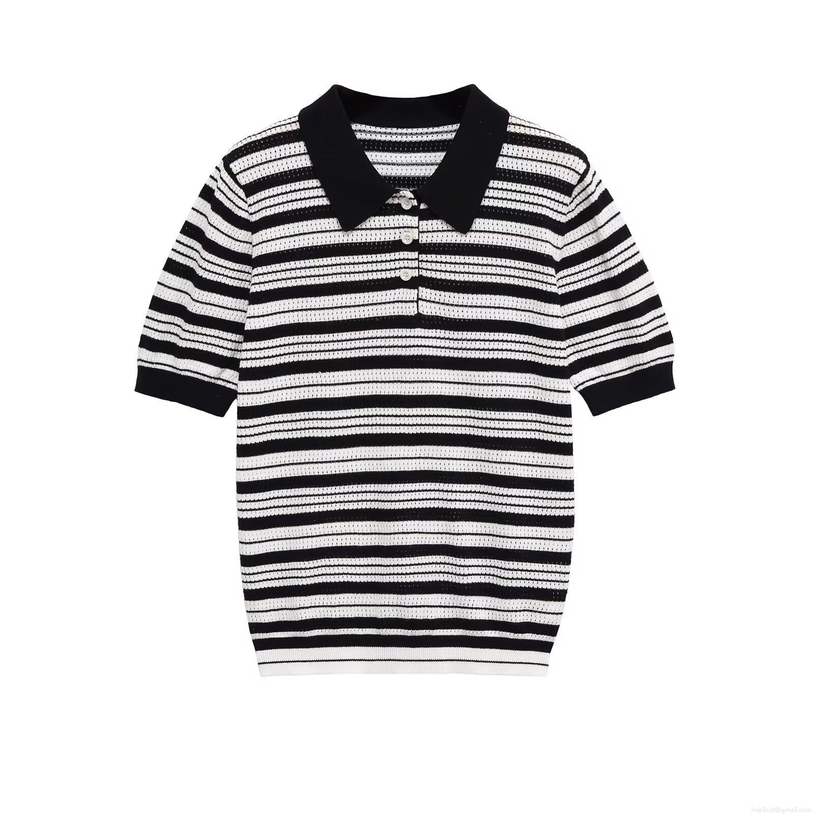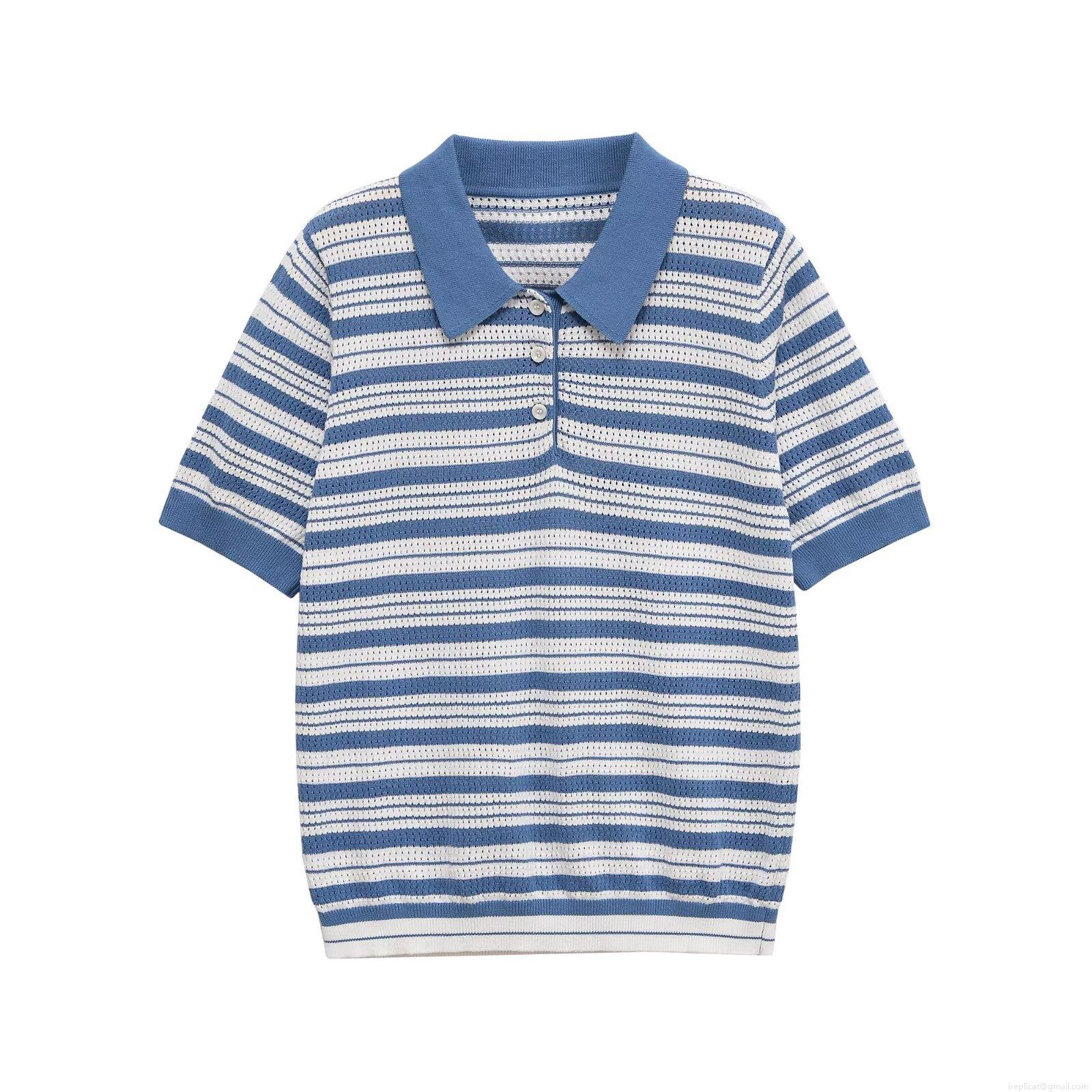 Women's Striped Polo Shirt Short Sleeve Knitted Top Contrast Color Casual T-Shirt With Buttons Hollow Texture Streetwear Summer Autumn Apparel