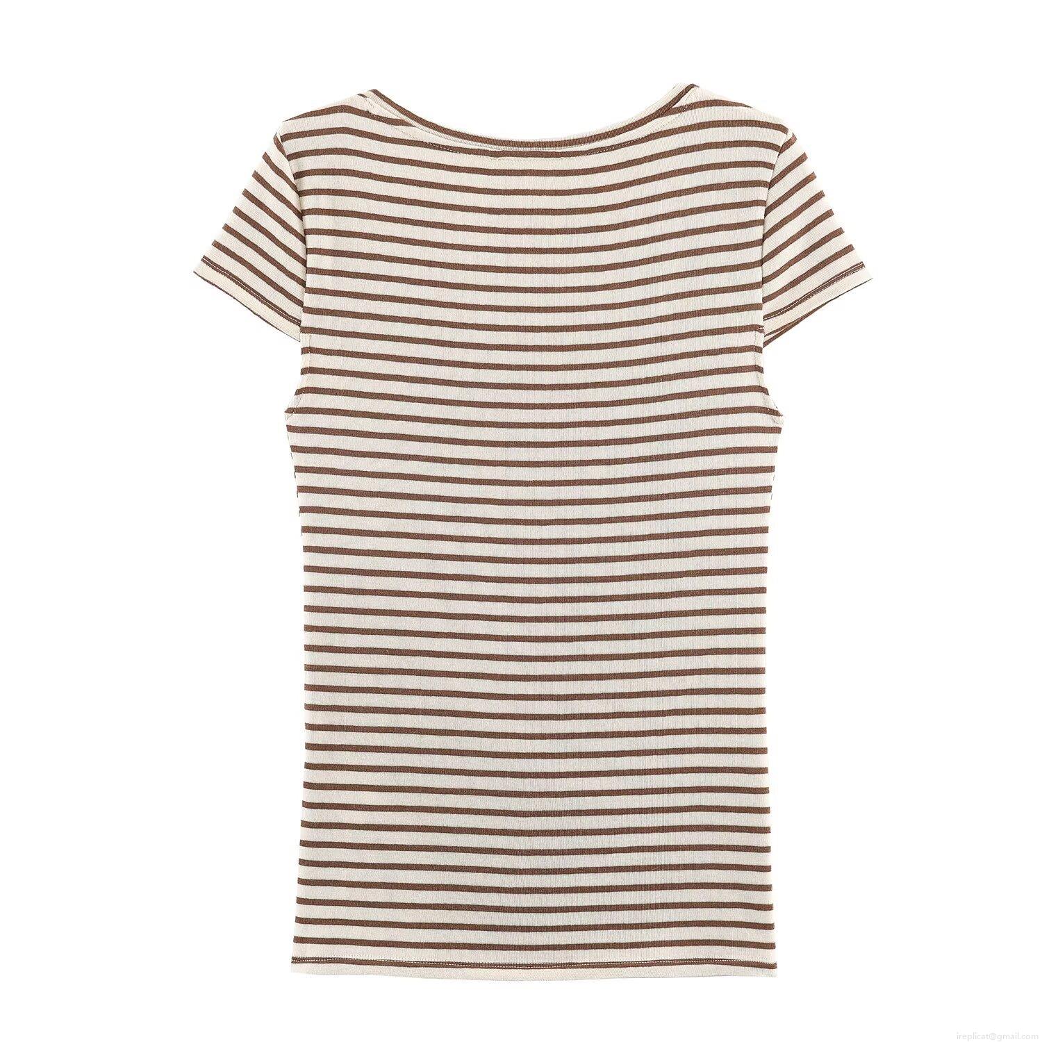 Women's Striped Ribbed Knit T-Shirt Brown White Round Neck Short Sleeve Slim Fit Summer Casual Streetwear Top