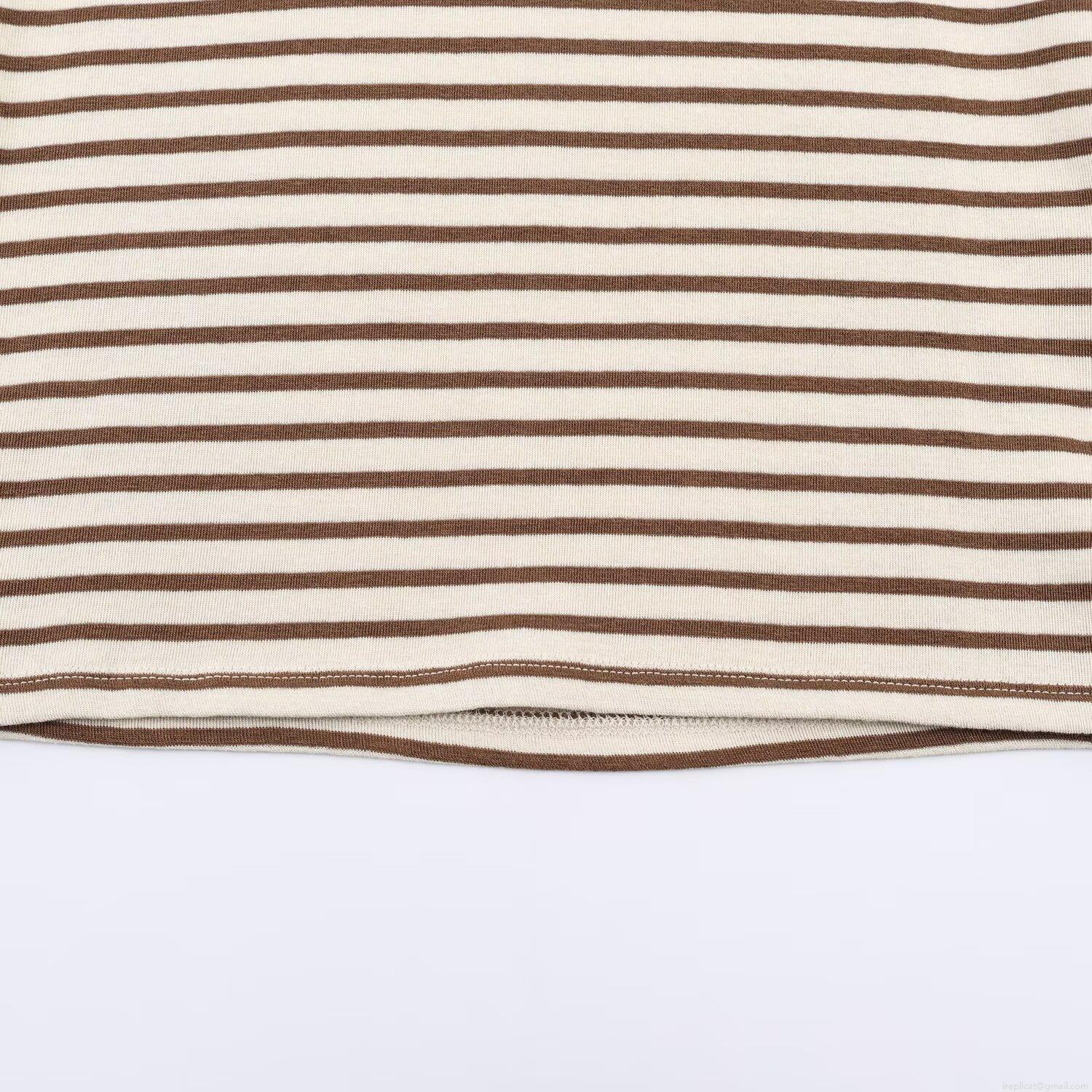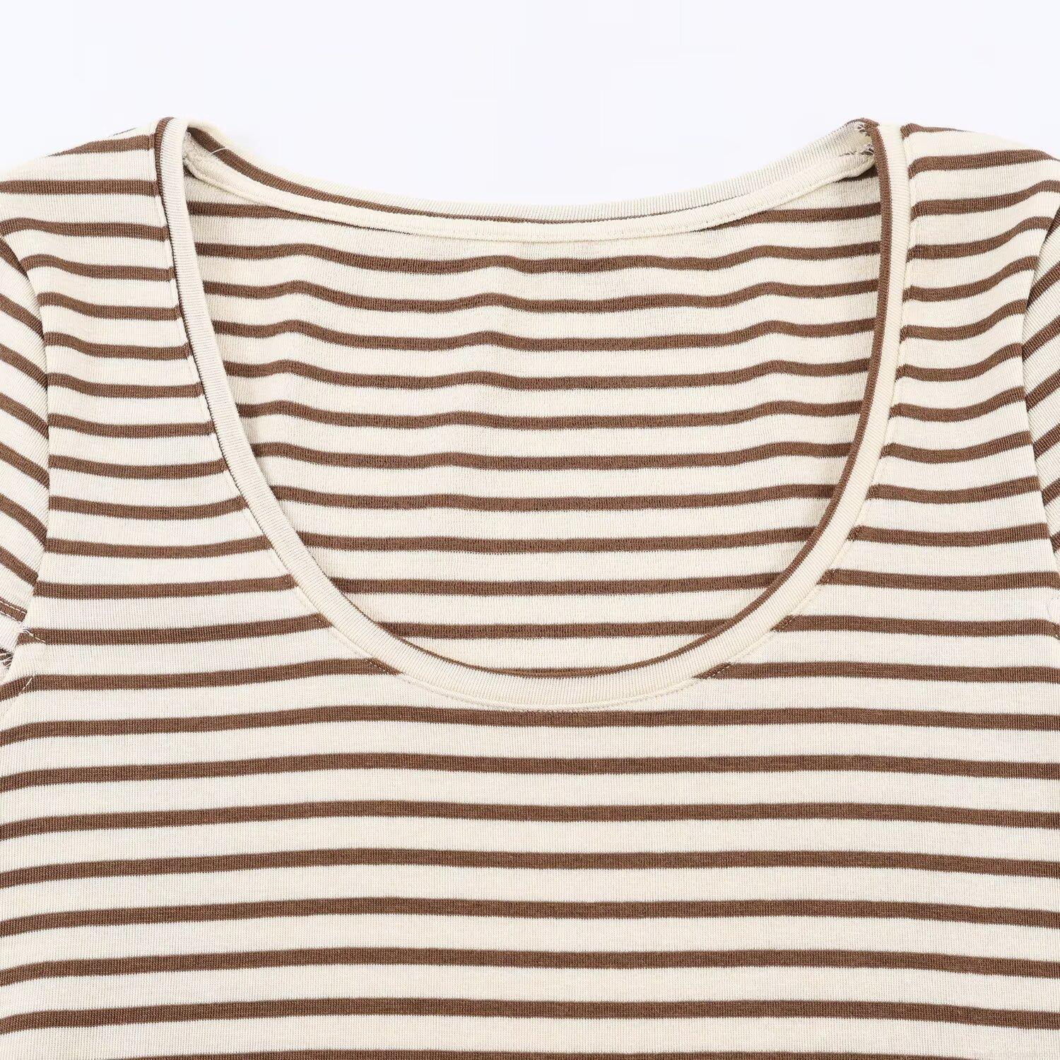 • Women's Striped Ribbed Knit T-Shirt Brown White Round Neck Short Sleeve Slim Fit Summer Casual Streetwear Top