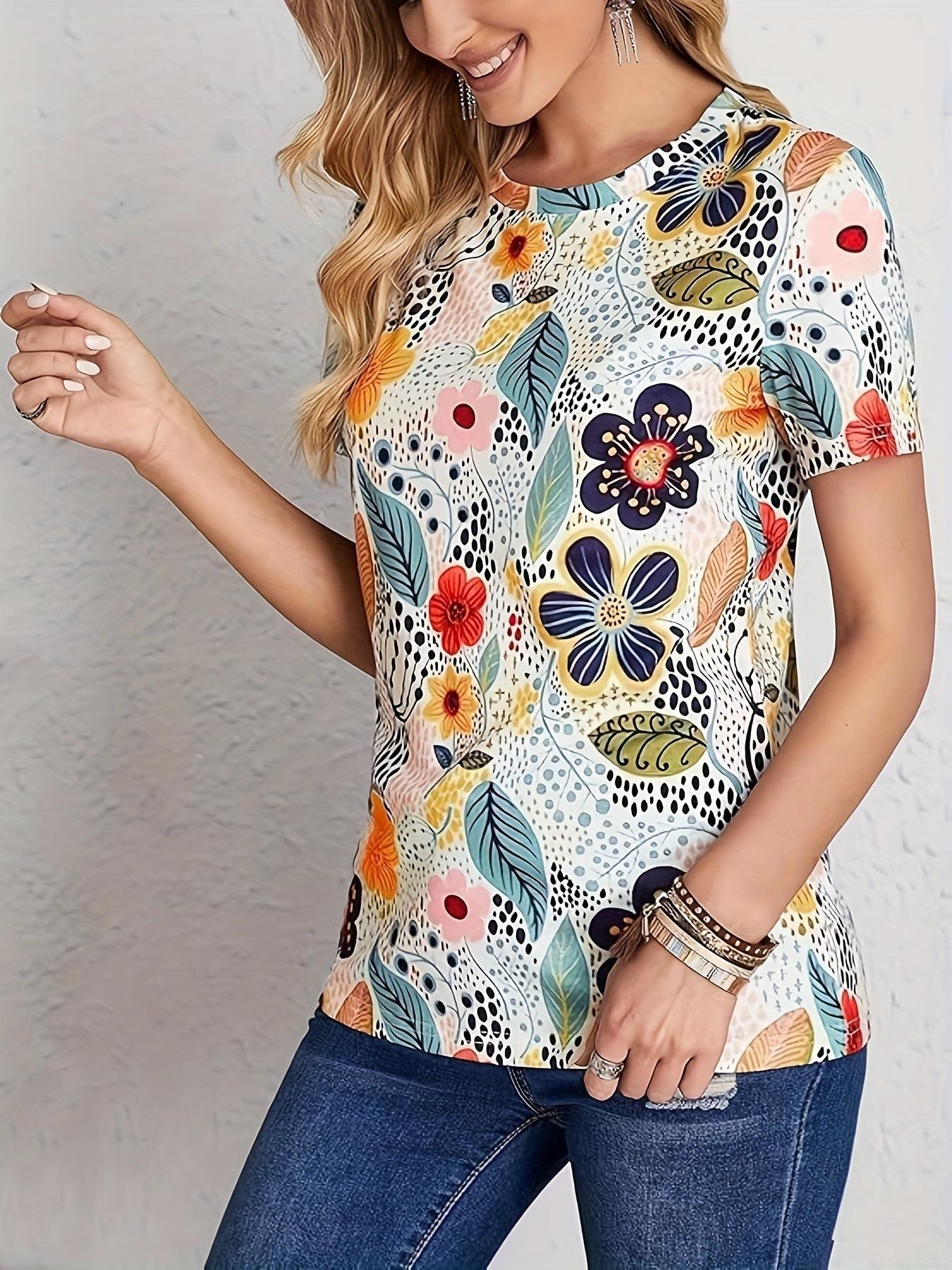 • Women's Summer Floral Print T-Shirt Casual Short Sleeve Round Neck Bohemian Polyester Top for Daily Travel Ladies Fashion Comfort