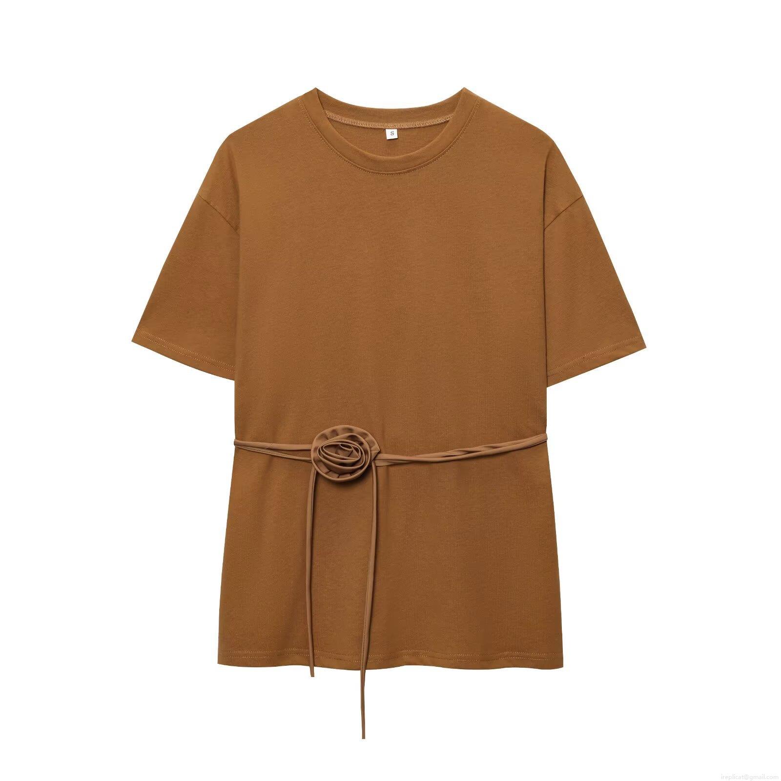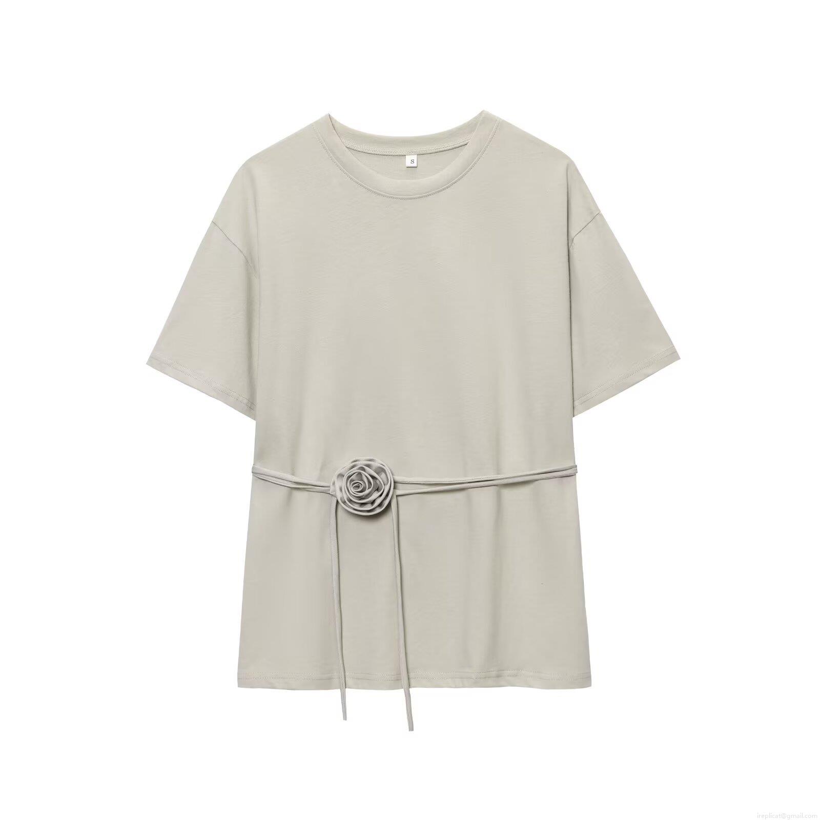 • Women's Summer Round Neck Short Sleeve T-Shirt With 3D Rose Flower Decorative Belt Solid Color Casual Street Style Top For Ladies Soft Polyester Tee
