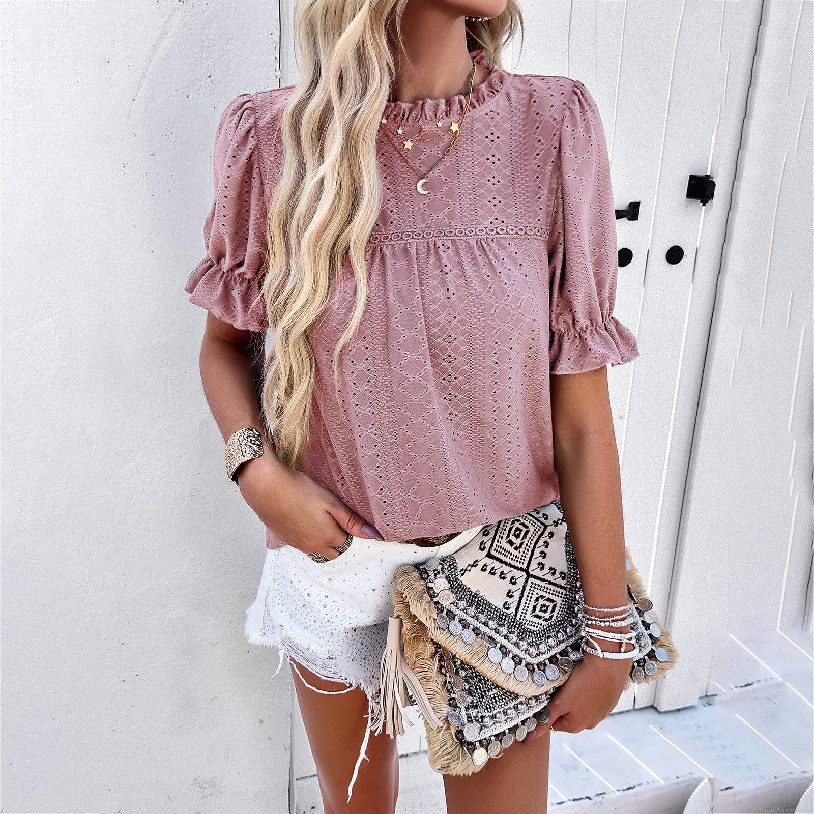 • Women's Summer Short Sleeve T-Shirt Hollow-out Embroidery Eyelet Top With Ruffle Collar And Puff Sleeves Casual Solid Color Polyester Blouse For Vacation Daily
