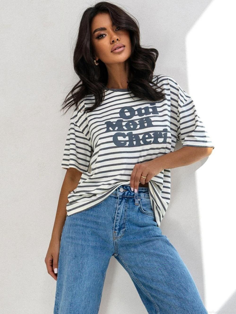Women's Summer Striped Short Sleeve T-Shirt French Oui Mon Cheri Letter Print Loose Cotton Blend Tee Vintage Casual Streetwear Top