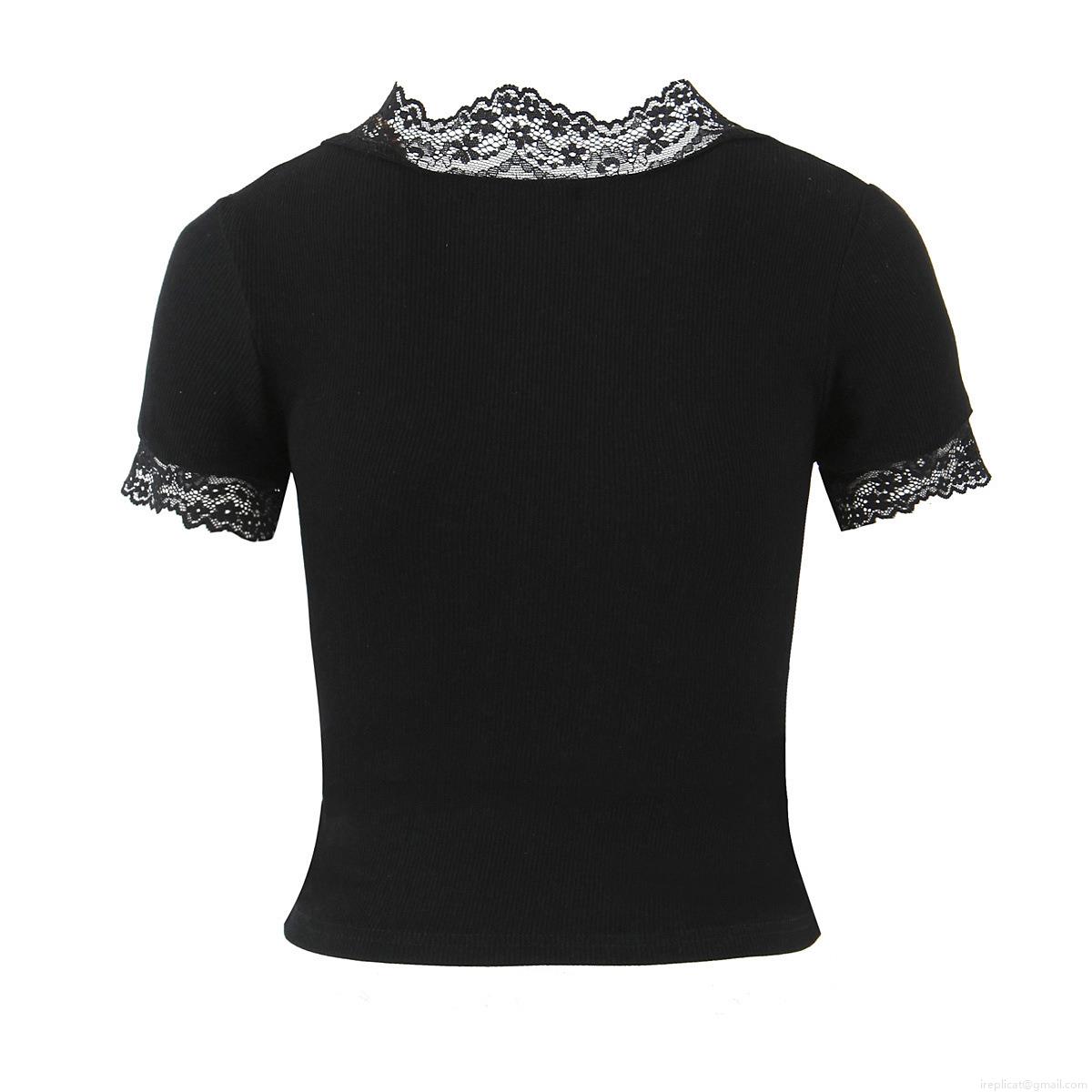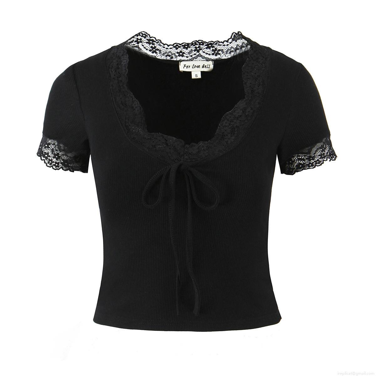 • Women's Summer V-Neck Lace Patchwork T-Shirt Sexy Short Sleeve Ribbed Knit Top With Bow Tie Front Casual Slim Fit Streetwear Cotton Blend Blouse