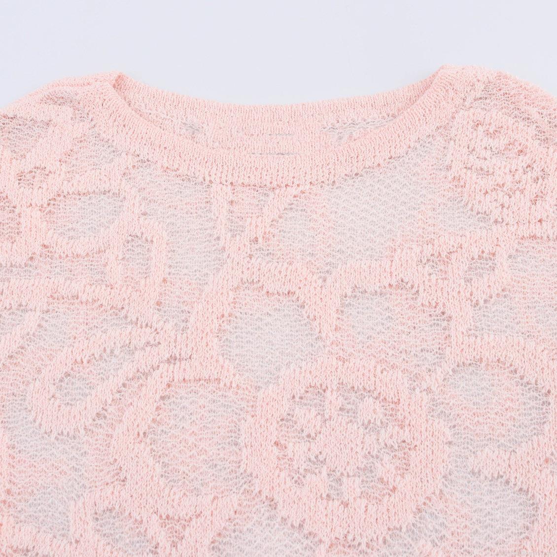 Women's Sweet Lace Floral T-Shirt Elegant Hollow Out Mesh Short Sleeve Round Neck Knit Top Pink Casual Blouse For Summer Ladies