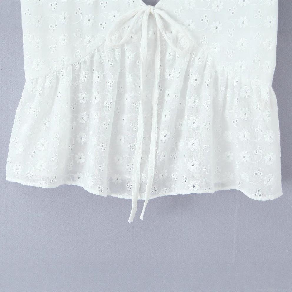 • Women's V Neck Hollow Out Eyelet Cotton T-Shirt Puff Short Sleeve Lace Embroidery Tie Front Crop Top Summer Casual French Style Streetwear Blouse