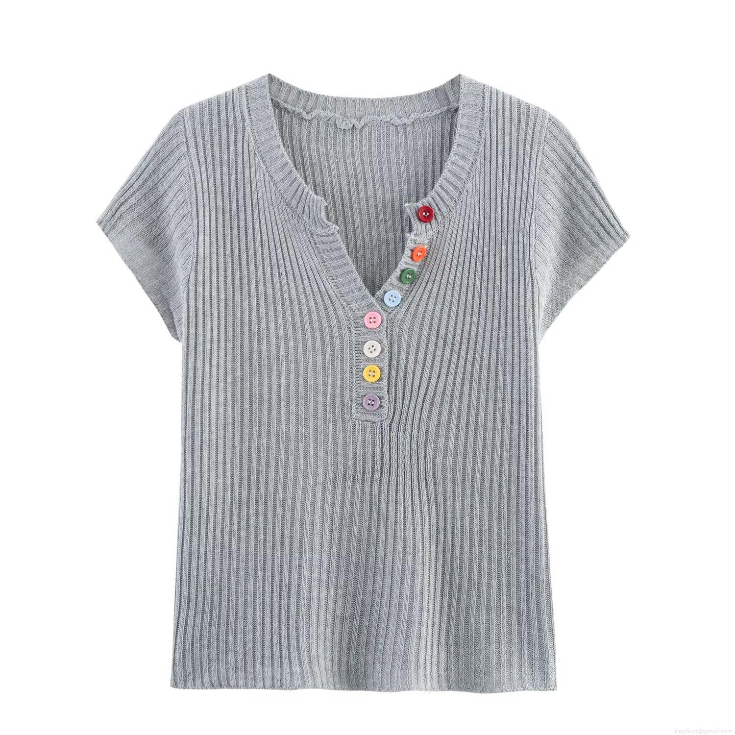Women's V Neck Knitted T-Shirt Ribbed Short Sleeve Top With Colorful Decorative Buttons Casual Slim Fit Polyester Summer Clothing For Ladies