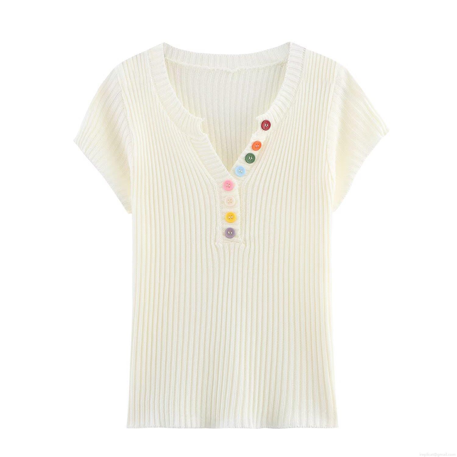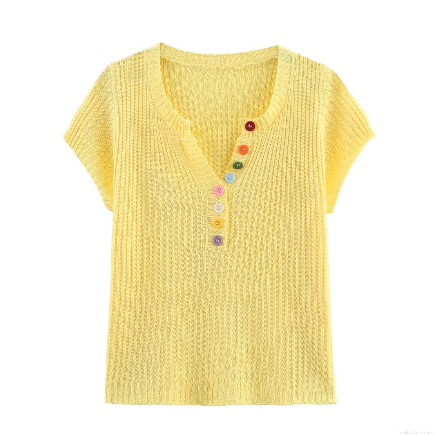 • Women's V Neck Knitted T-Shirt Ribbed Short Sleeve Top With Colorful Decorative Buttons Casual Slim Fit Polyester Summer Clothing For Ladies