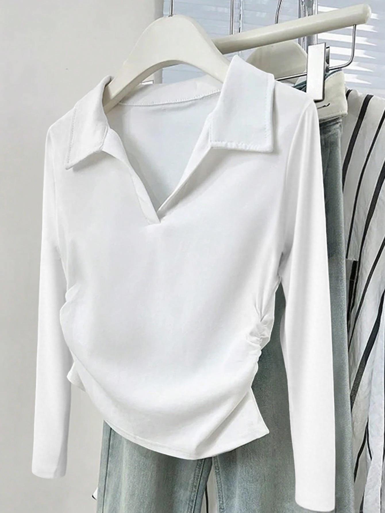 • Women's V Neck Long Sleeve Polo Shirt Slim Fit Ribbed Knit Top Casual Ruched Side T-Shirt Polyester Spandex Blouse For Autumn Winter