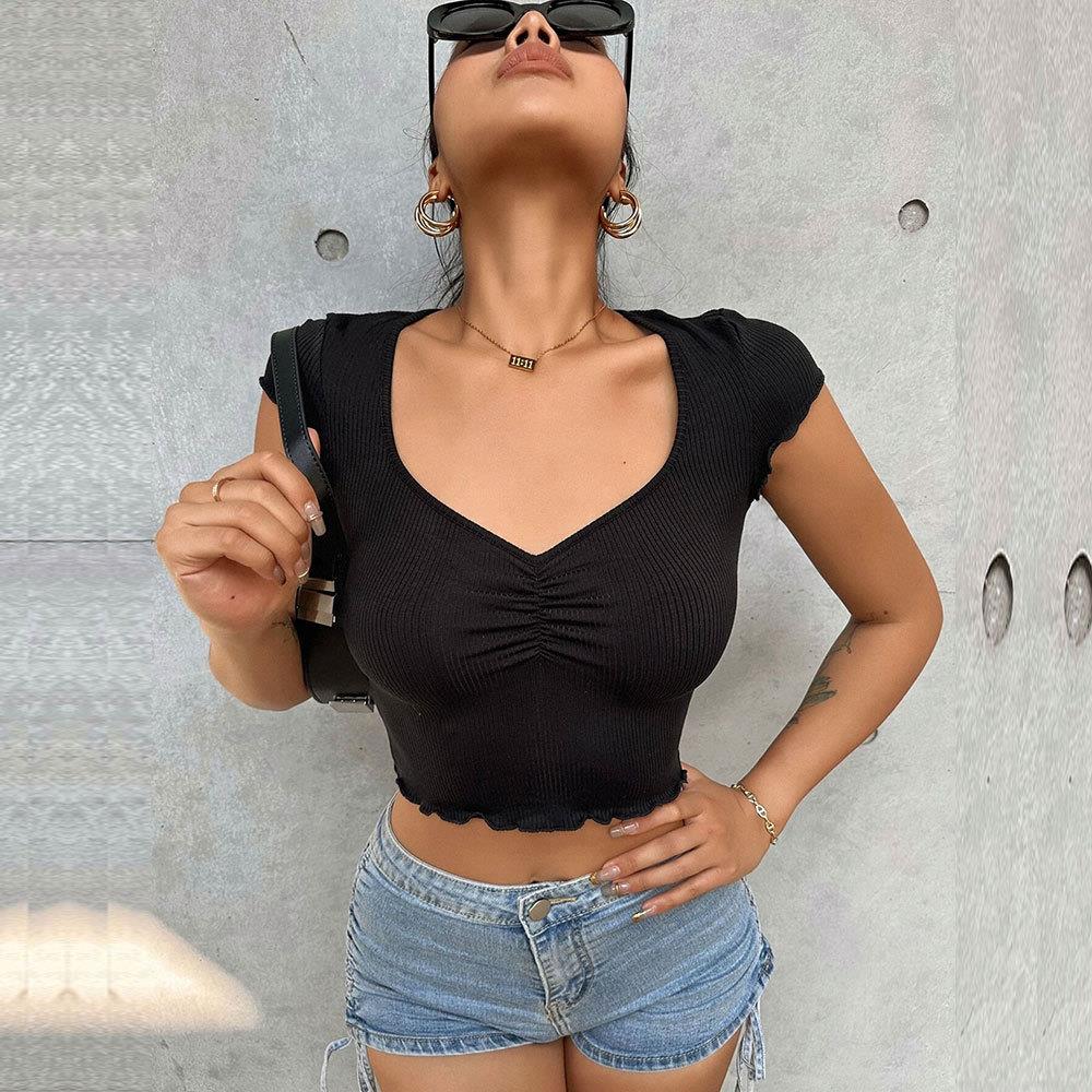• Women's V Neck Ruched Ribbed Crop Top Sexy Slim Fit Short Sleeve Polyester Elastane T-Shirt Solid Color Summer Casual Streetwear