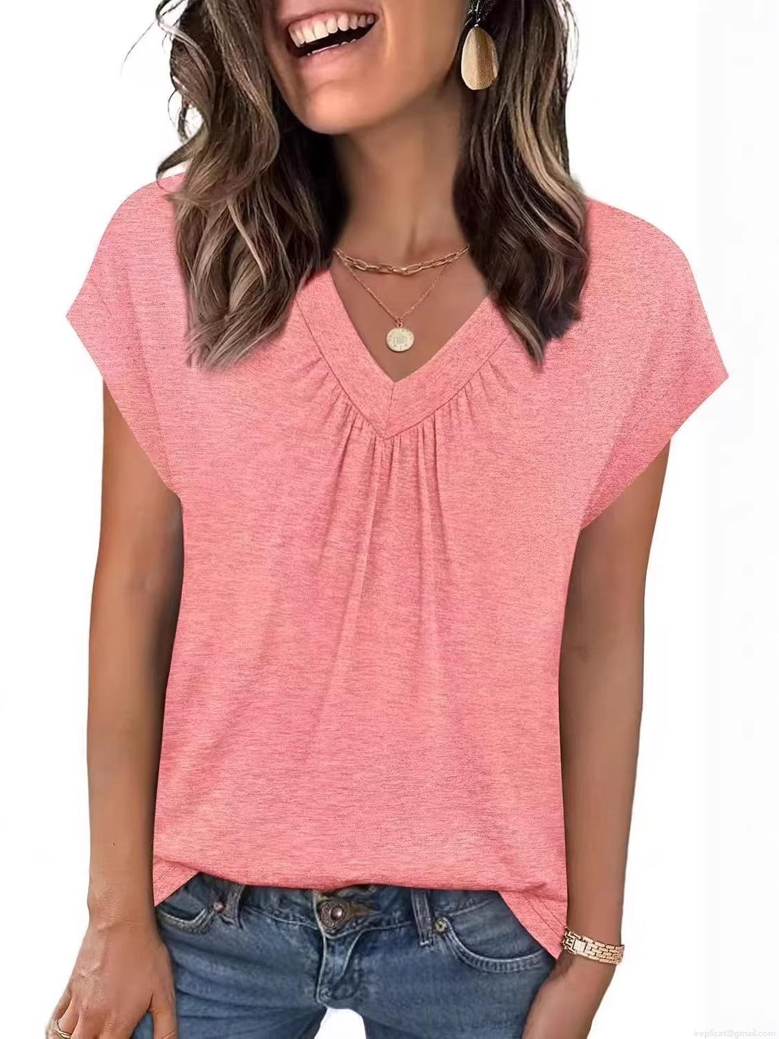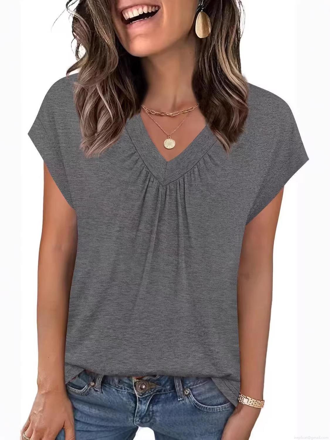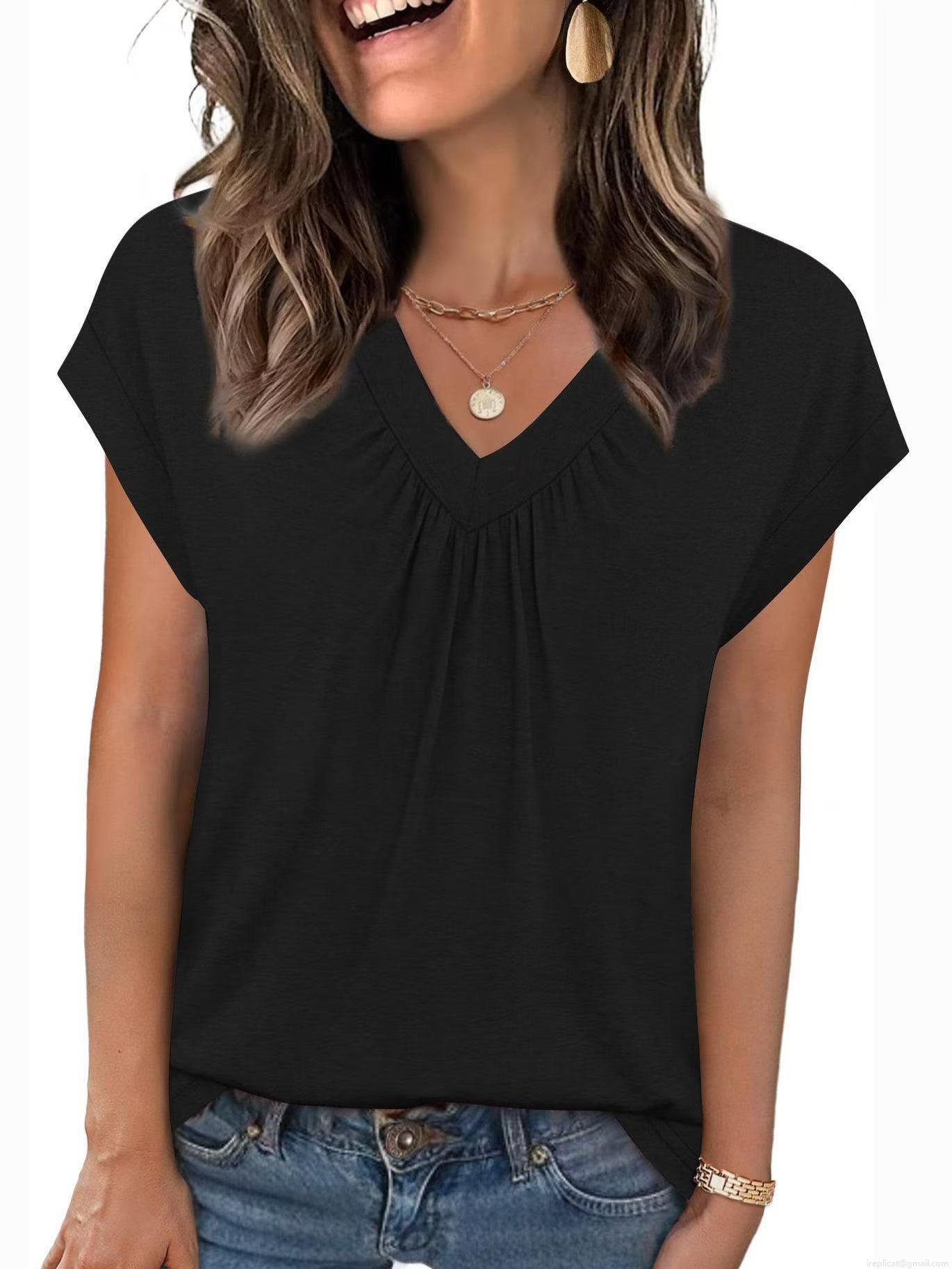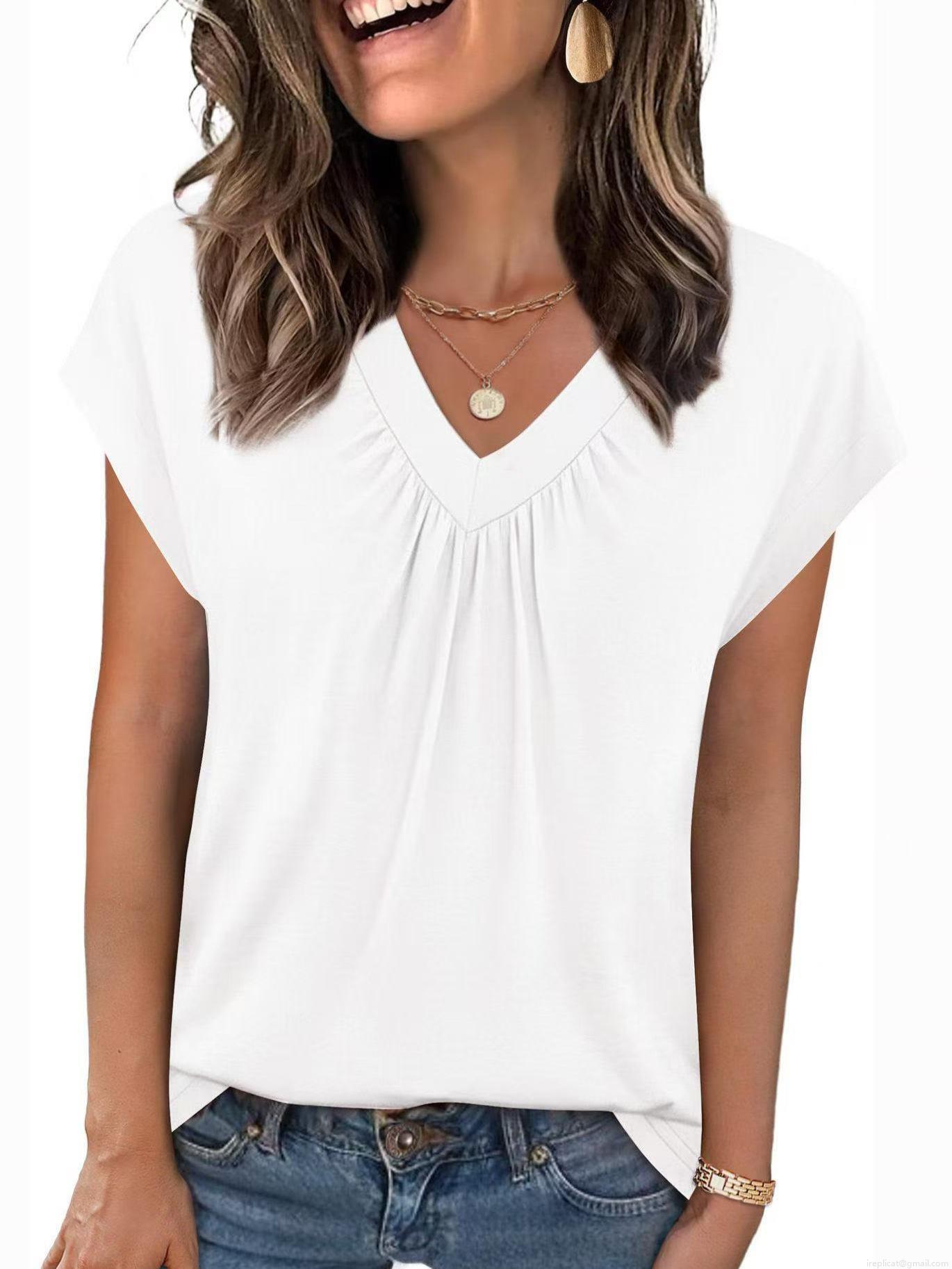 • Women's V Neck Short Sleeve T-Shirt Casual Loose Summer Top With Pleated Detail Solid Color Polyester Blouse For Everyday Office Wear Ladies Fashion