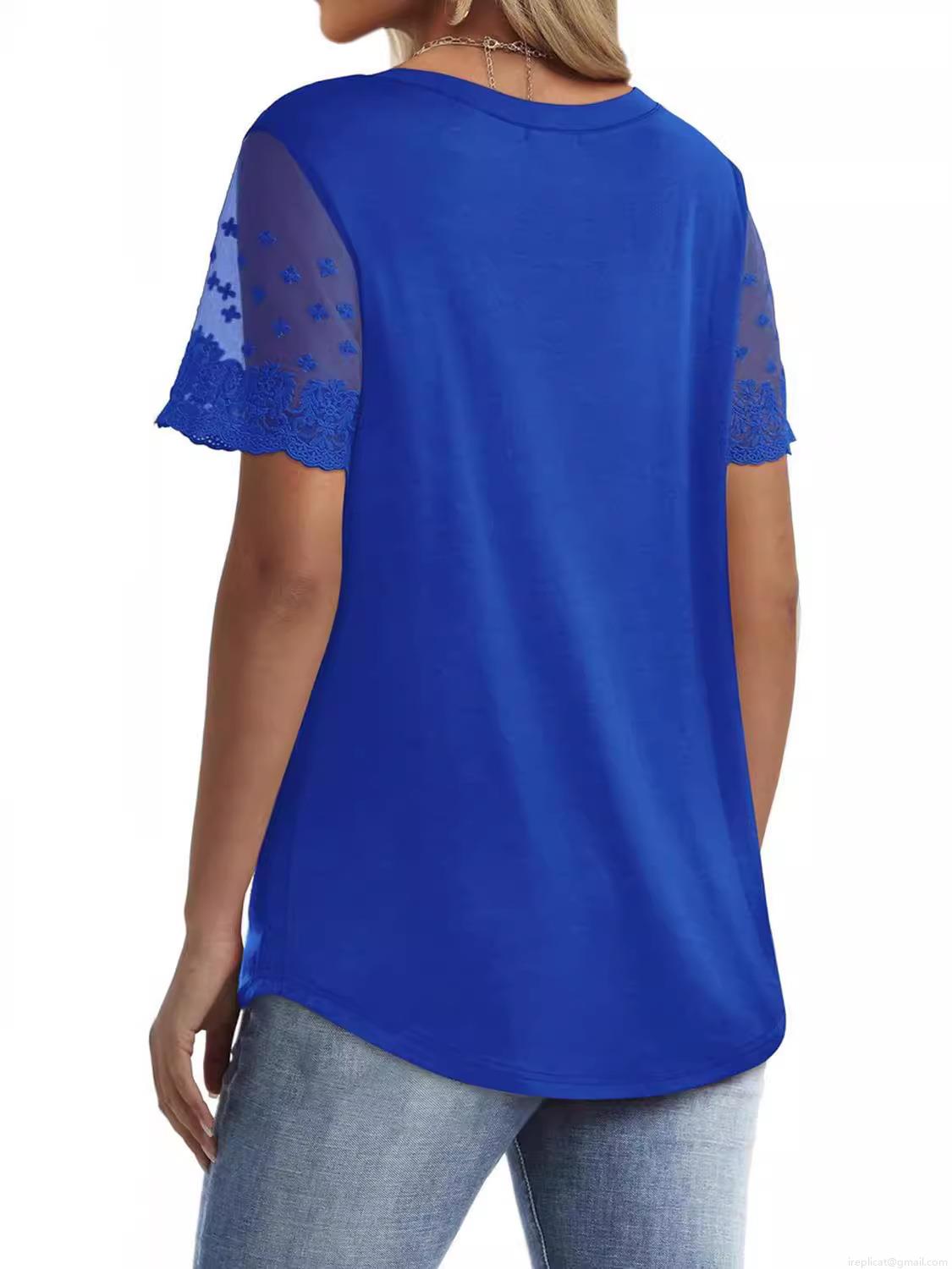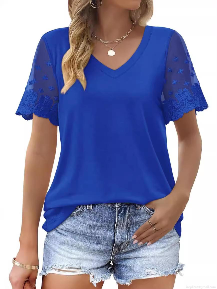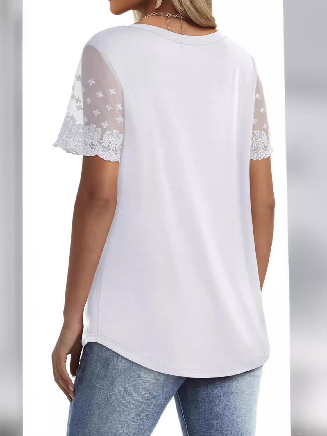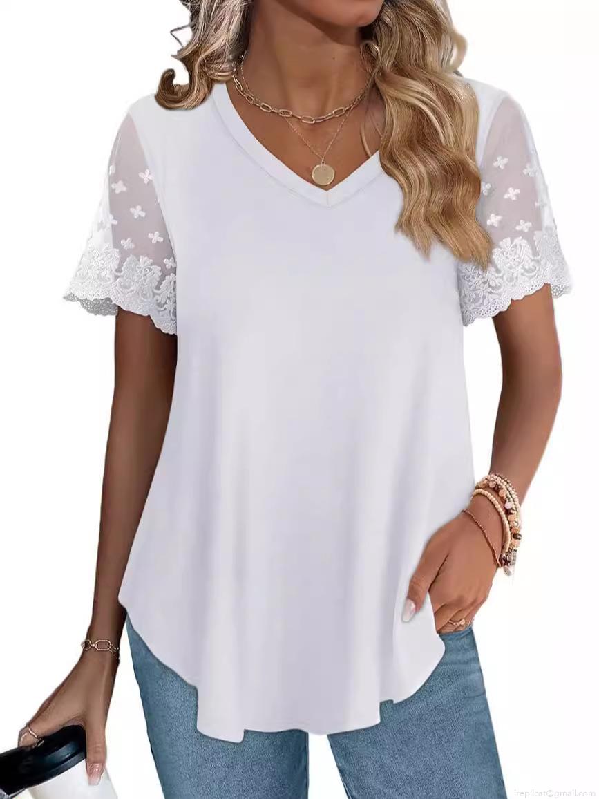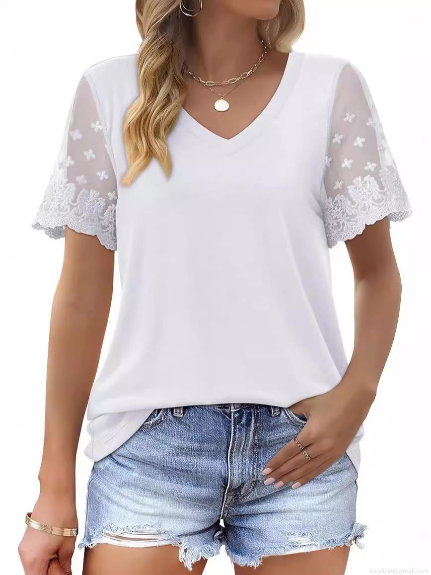 • Women's V Neck Short Sleeve T-Shirt Lace Patchwork Sleeve Solid Color Loose Fit Polyester Spandex Summer Casual Streetwear Tee Top For Ladies