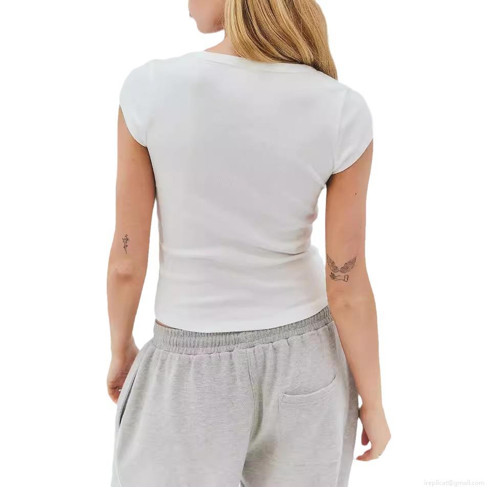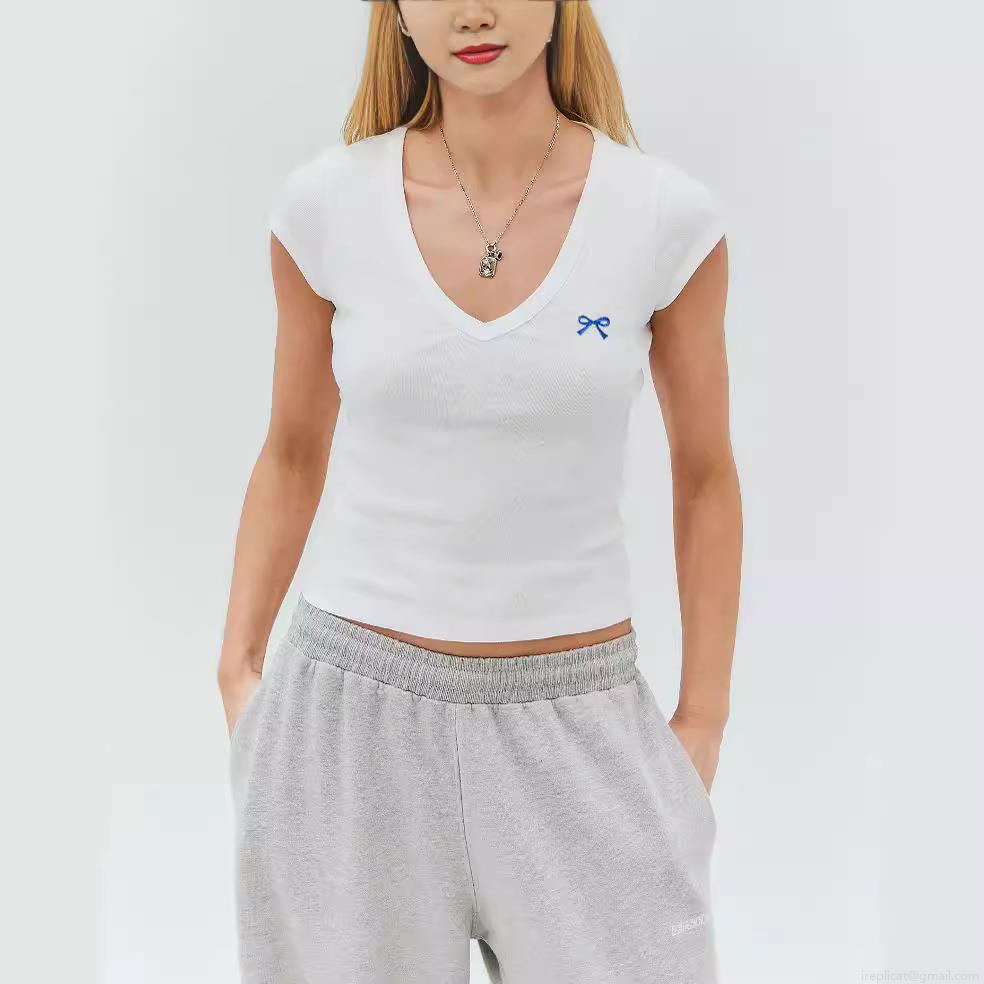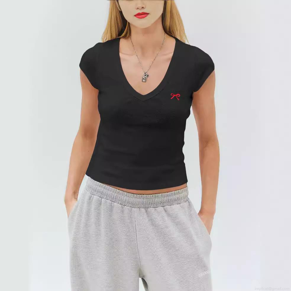 • Women's V Neck Short Sleeve T-Shirt Slim Fit Ribbed Knit Top Embroidered Bow Polyester Spandex Casual Streetwear Tee Summer Spring Fashion Tops