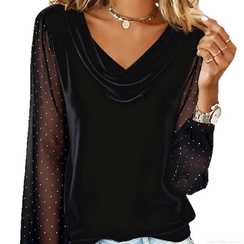 • Women's Velvet Mesh Patchwork T-Shirt Cowl V-Neck Polka Dot Sheer Sleeve Top Elegant Casual Autumn Tee For Women
