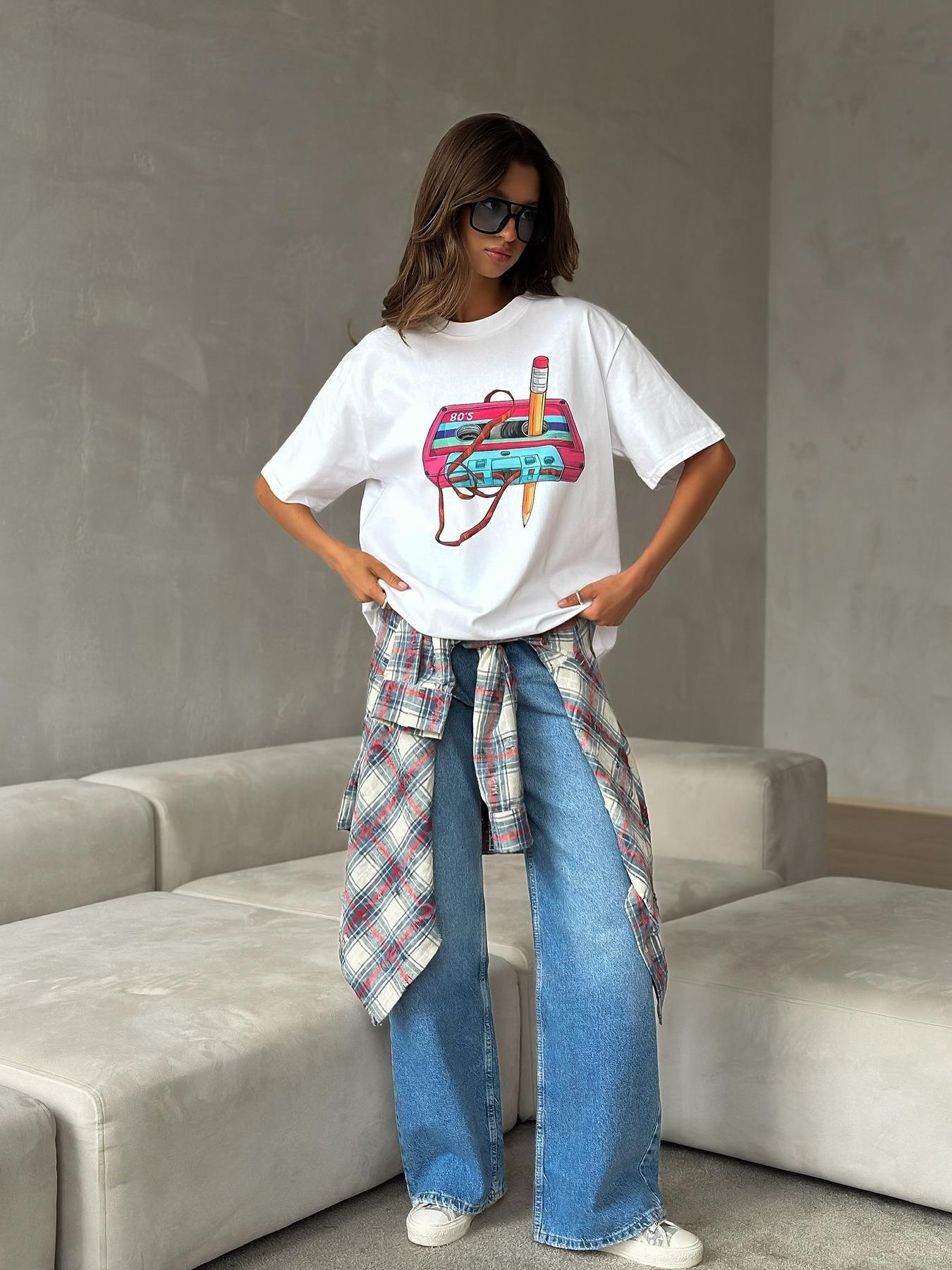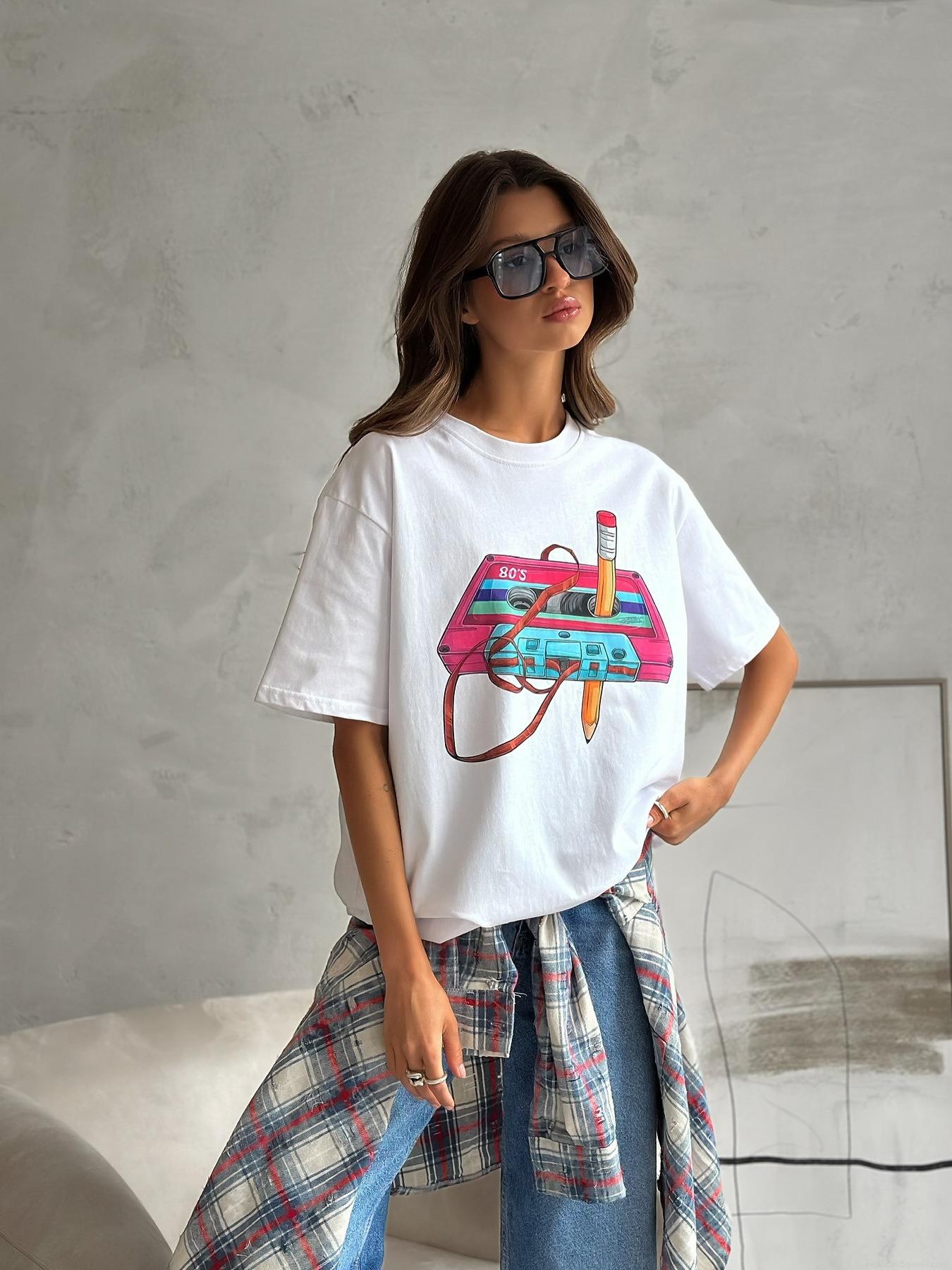 Pencil, Letters, Retro Prints, Loose Fit, Retro Cassette Tape, Drop Shoulder Design, 80'S