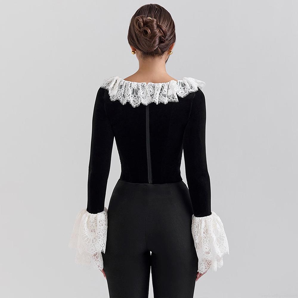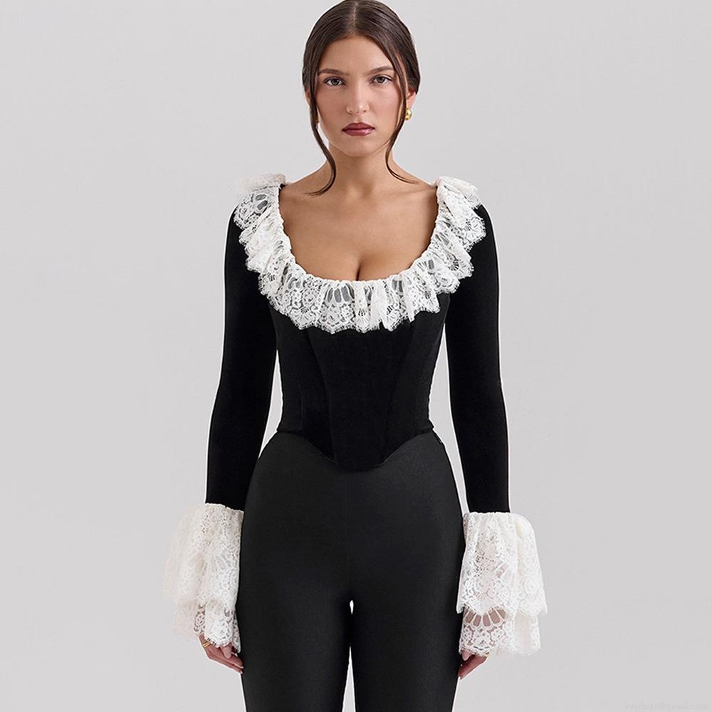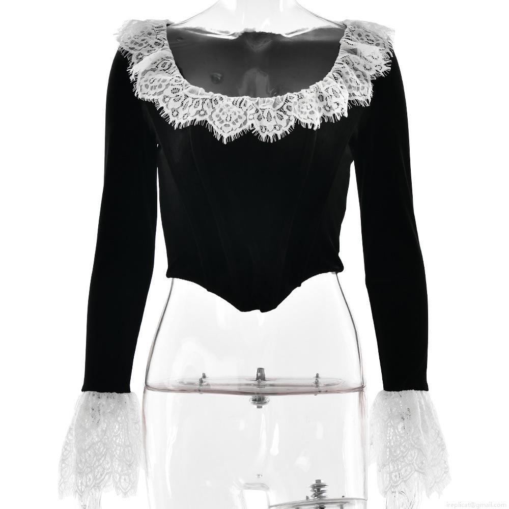 • Women's Vintage Velvet Patchwork Lace Flare Sleeve T-Shirt Sexy Gothic Boning Corset Top Streetwear Party Retro U-Neck Slim Long Sleeve Top