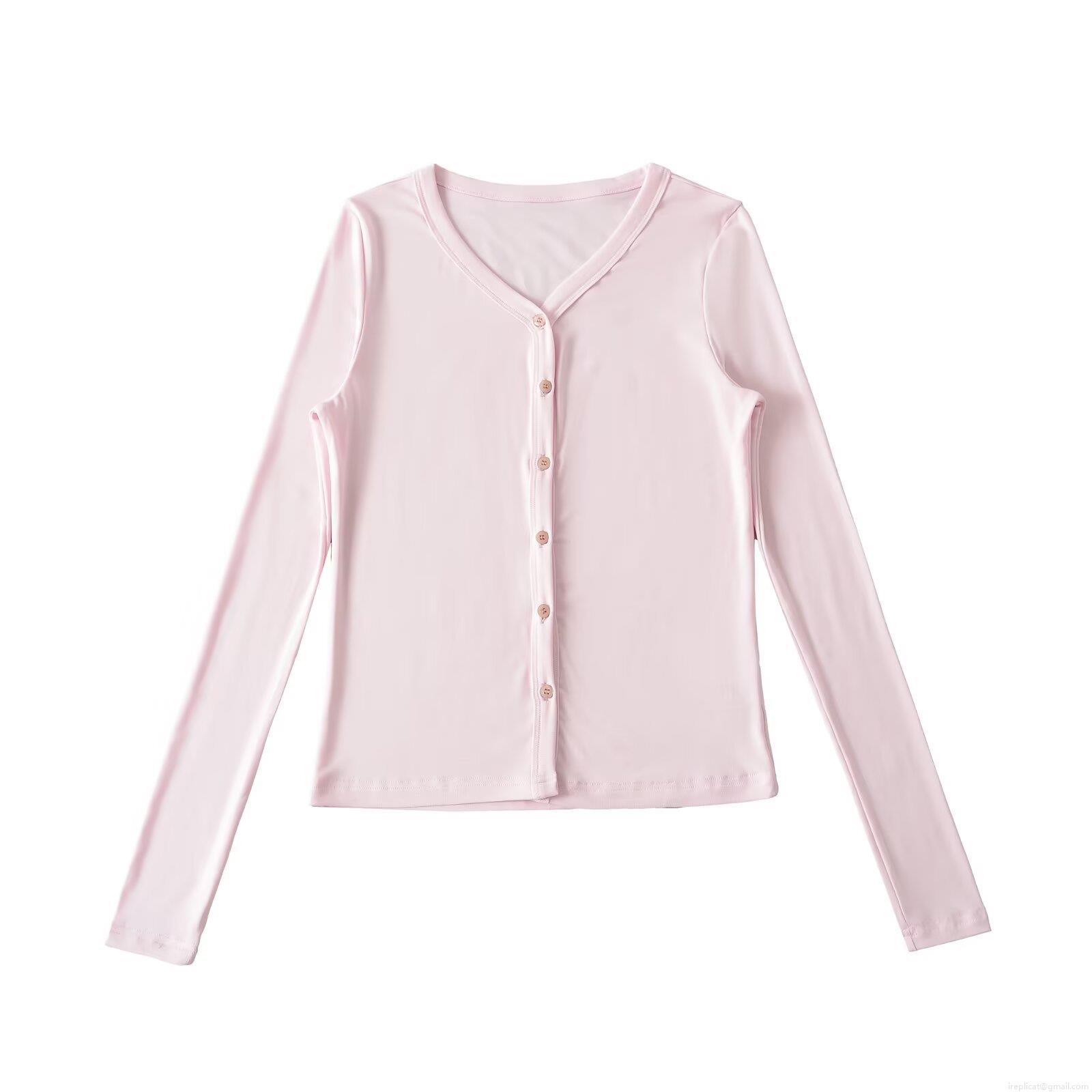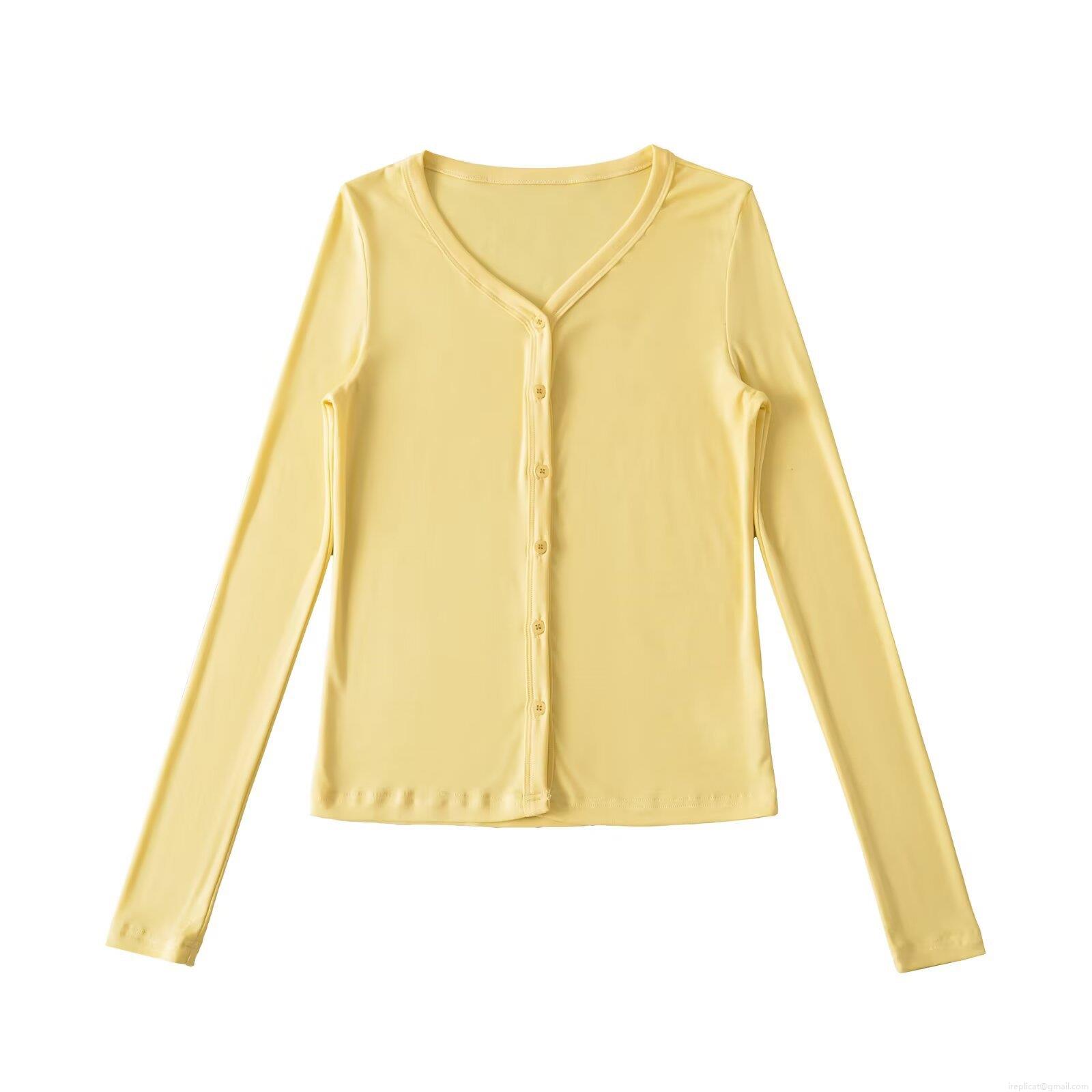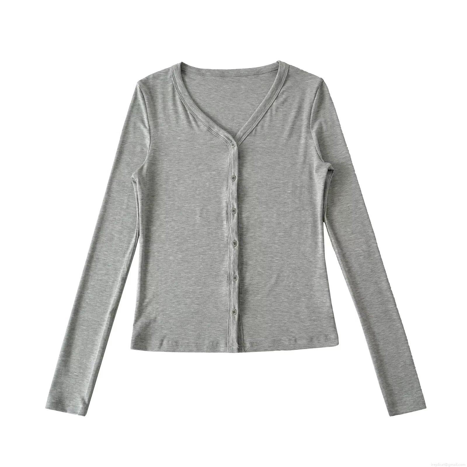Women's V-Neck Long Sleeve Single Breasted Cardigan Top Casual Polyester Blend Solid Color Button Up T-Shirt For Autumn Streetwear Fashion