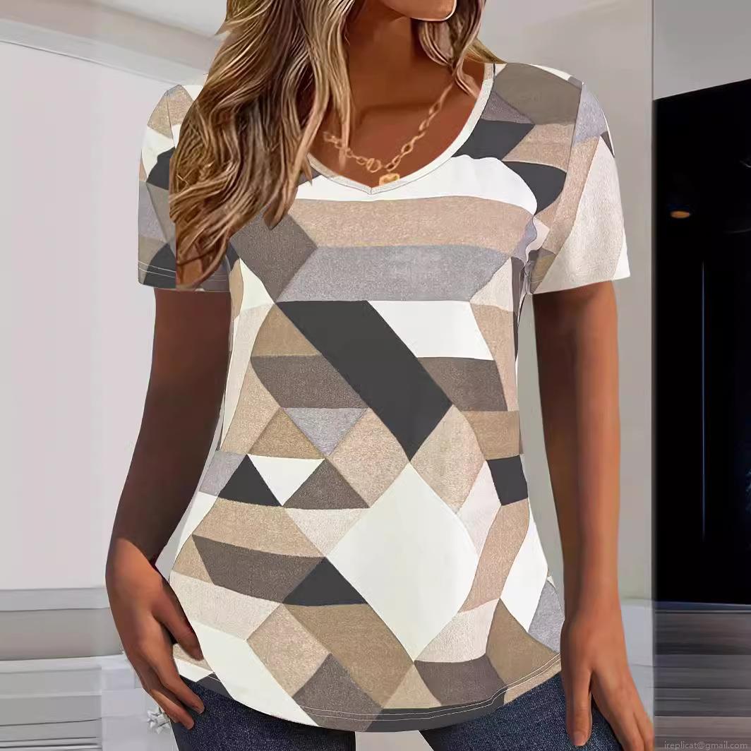 • Women's V-Neck Short Sleeve T-Shirt Casual Loose Polyester Spandex Blend Geometric Print Color Block Summer Top For Daily Vacation