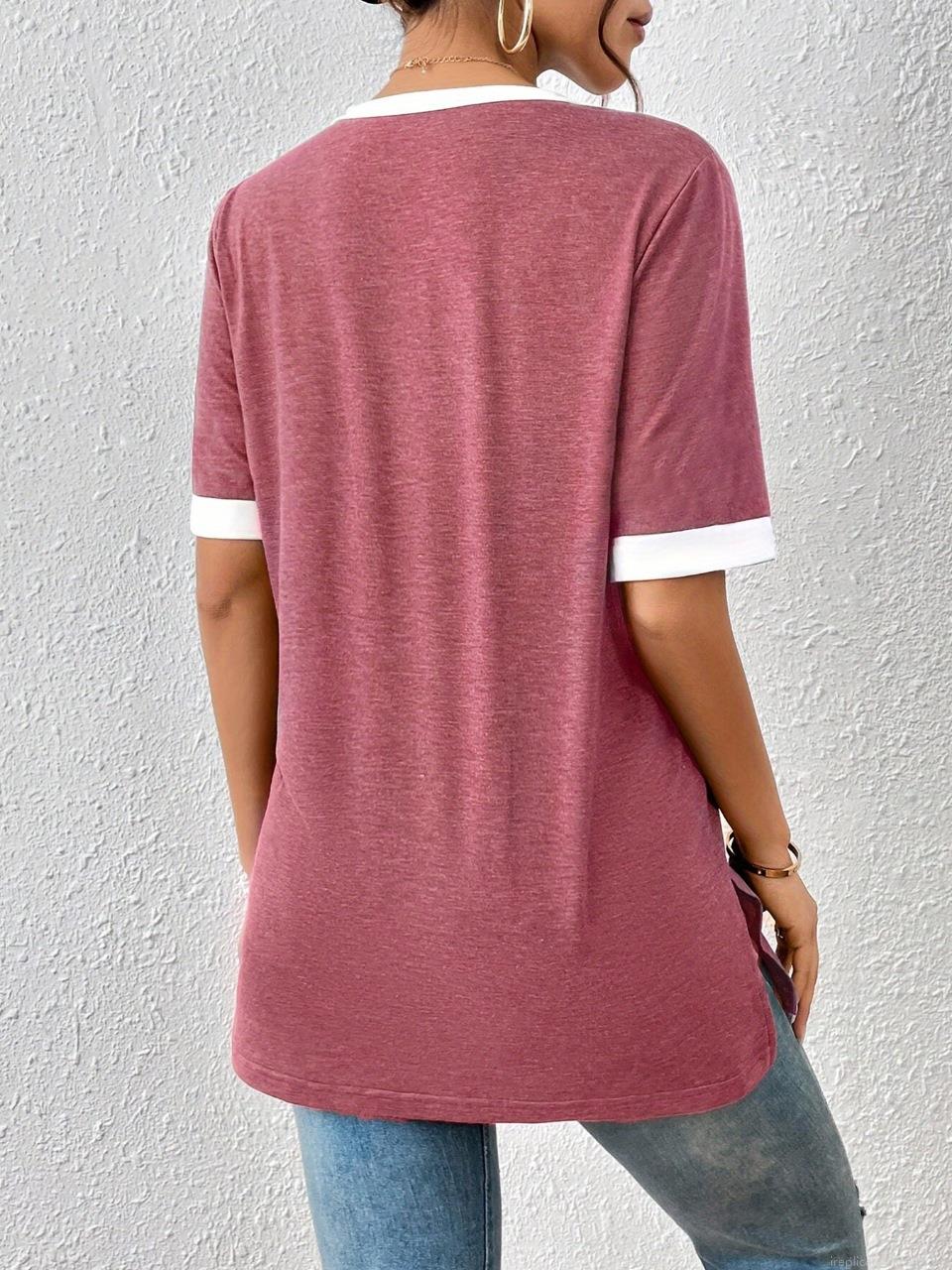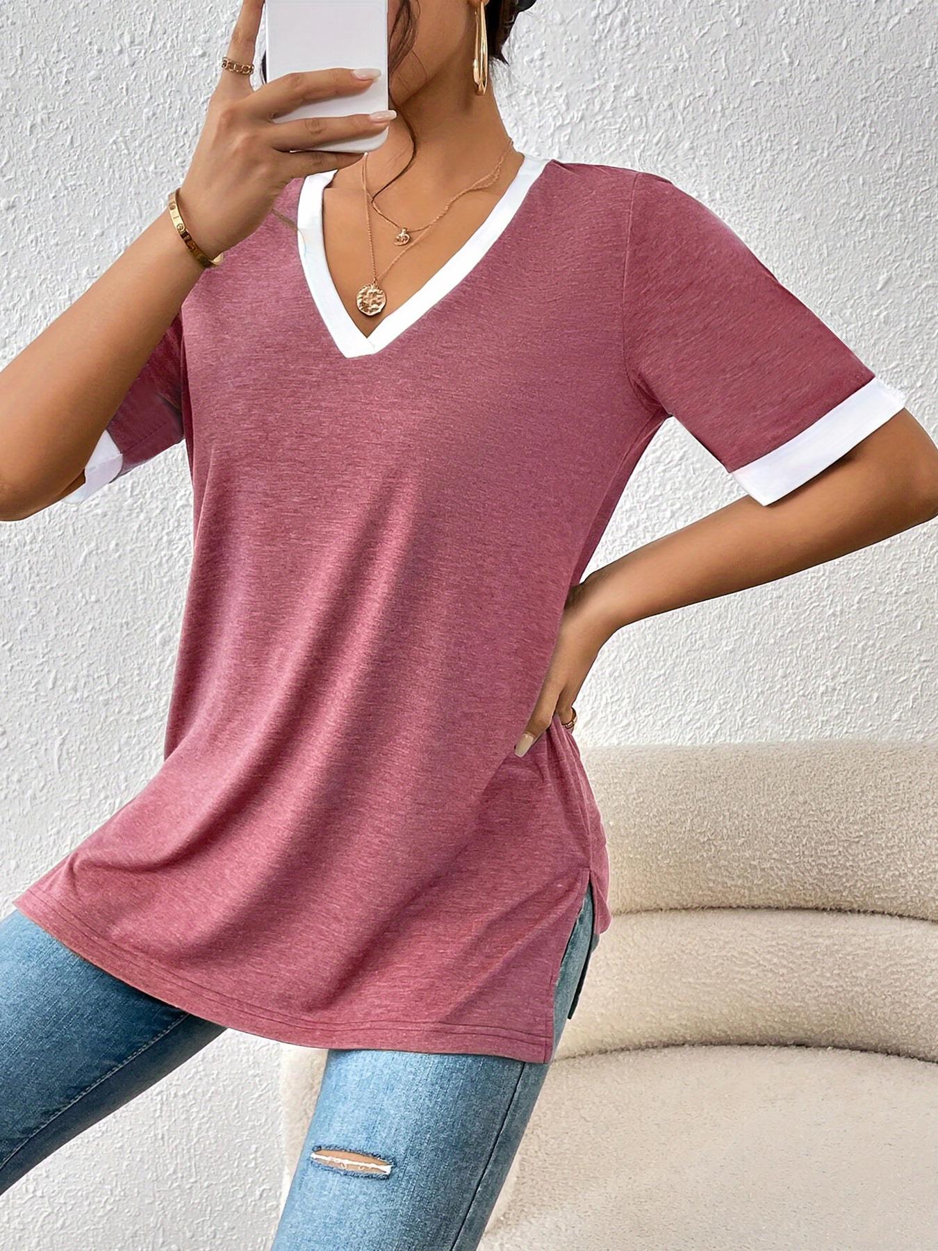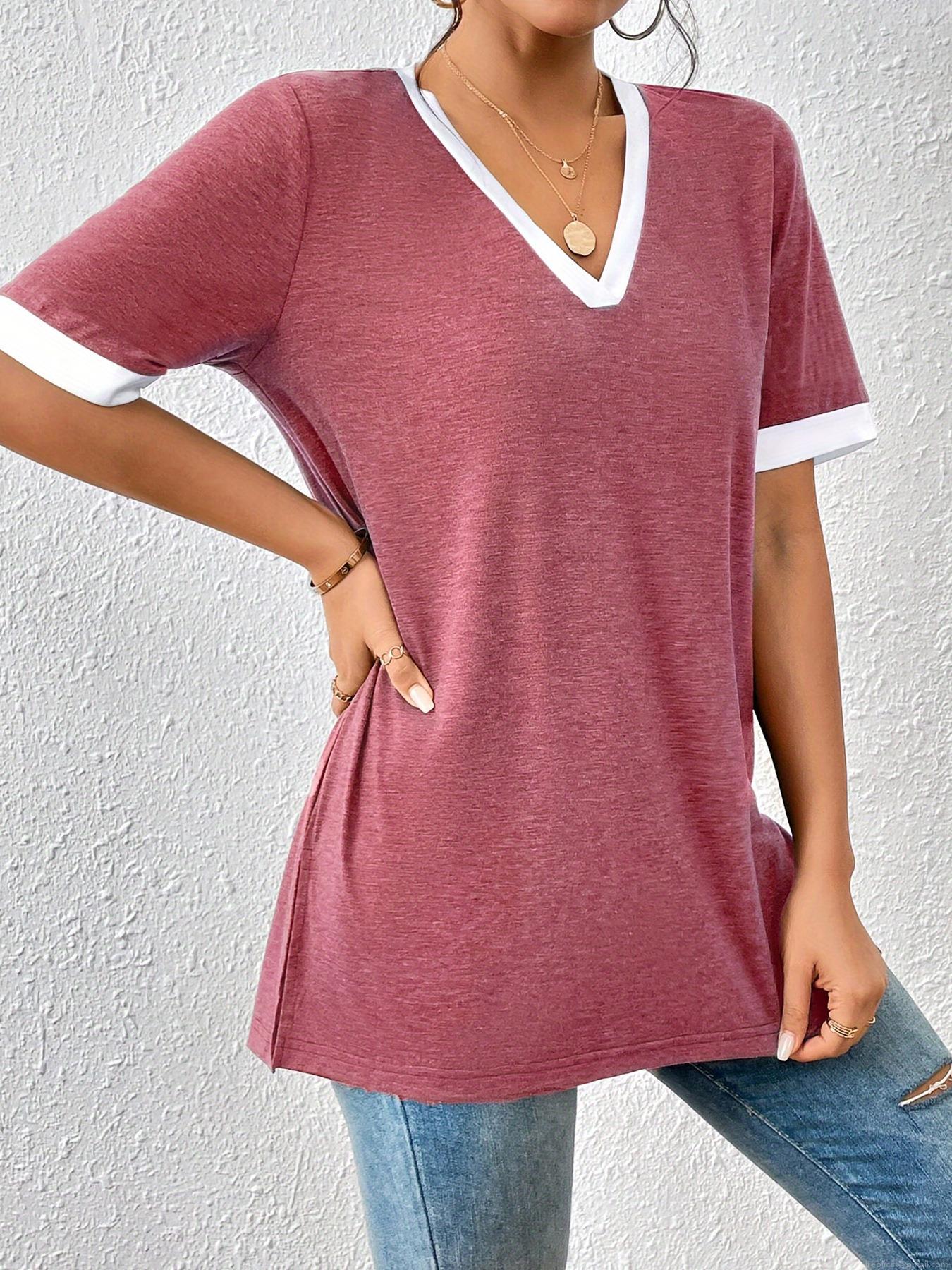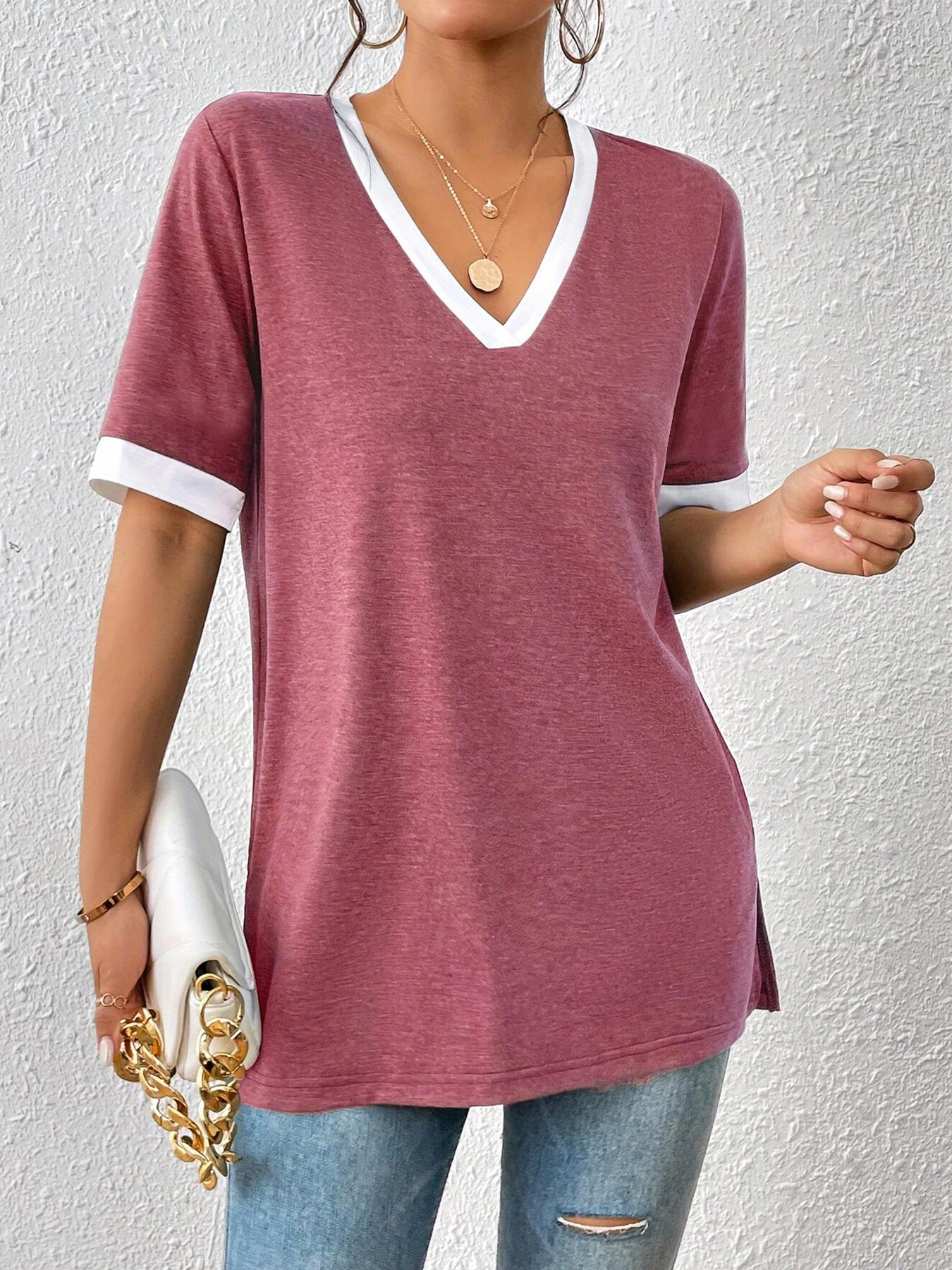 • Women's V-Neck Short Sleeve T-Shirt Contrast Color Trim Knit Top Casual Slim Fit Mid-Length Tee for Daily Party Women Soft Breathable Clothing