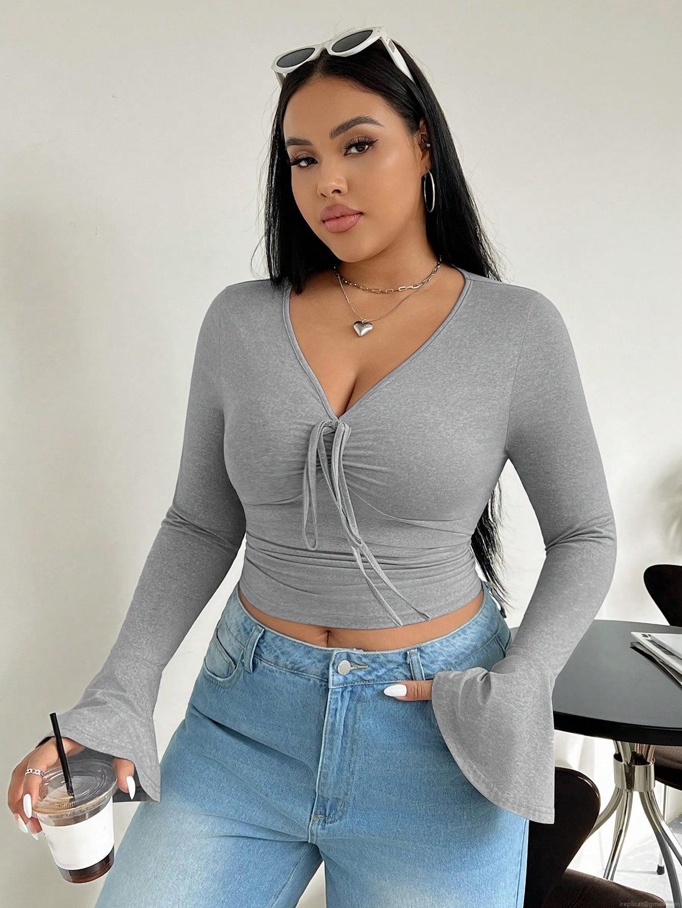Women's V-Neck T-Shirt Plus Size Flare Sleeve 95% Polyester 5% Elastane Drawstring Ruched Slim Fit Cropped Top For Casual Party Sexy Style