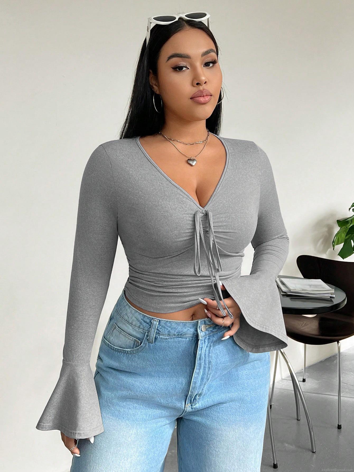 • Women's V-Neck T-Shirt Plus Size Flare Sleeve 95% Polyester 5% Elastane Drawstring Ruched Slim Fit Cropped Top For Casual Party Sexy Style