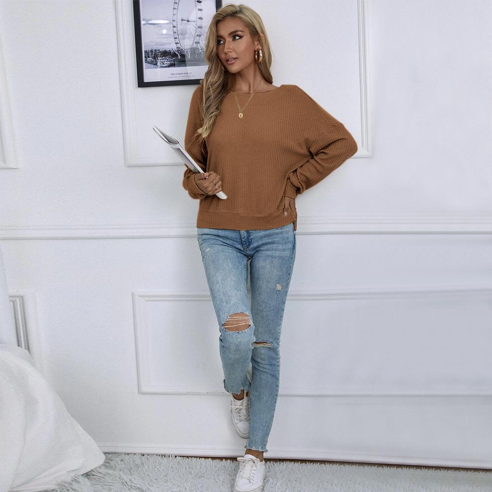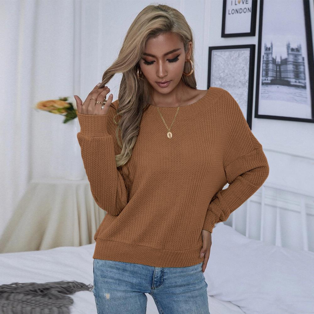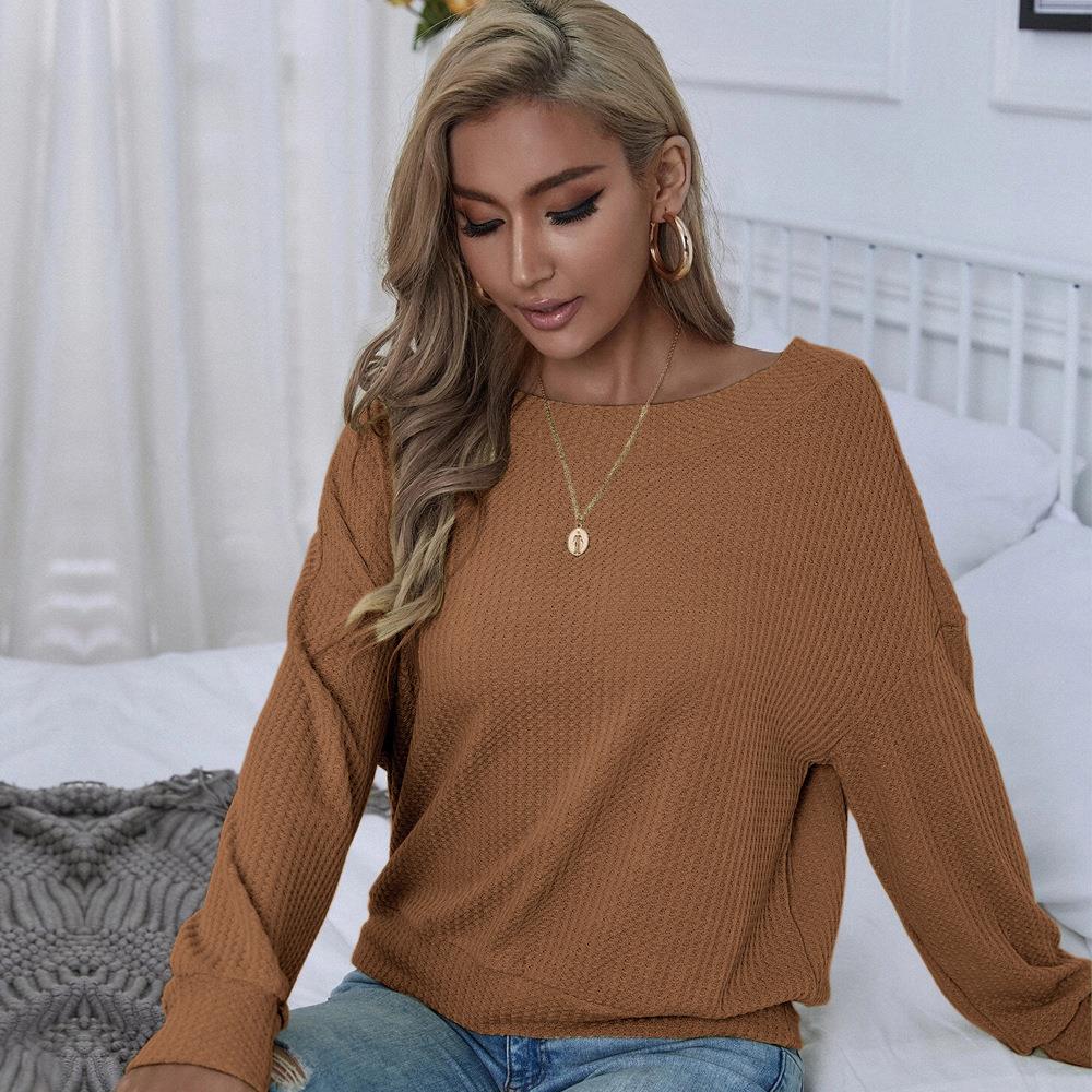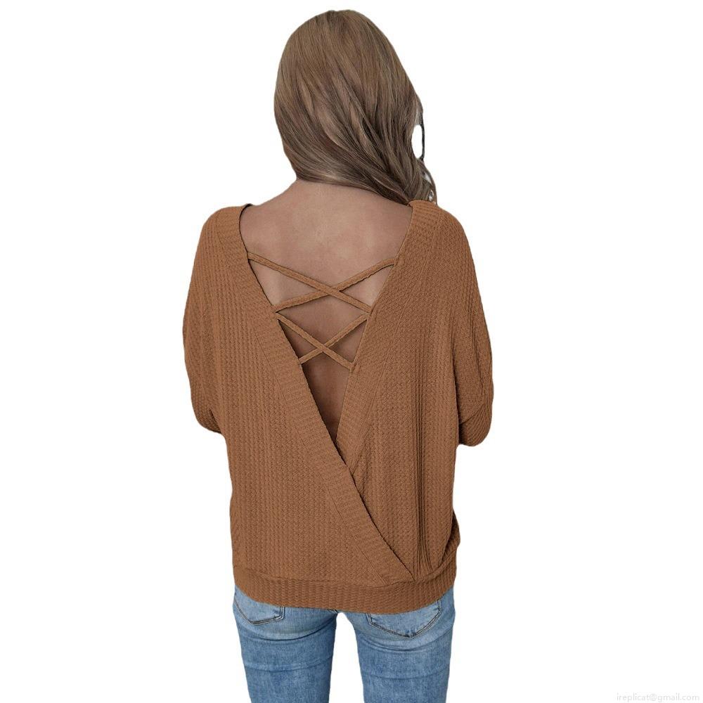 • Women's Waffle Knit T-Shirt Sexy Backless V-Neck Criss-Cross Straps Long Sleeve Loose Fit Pullover Top For Autumn Winter Casual Party Fashion Brown