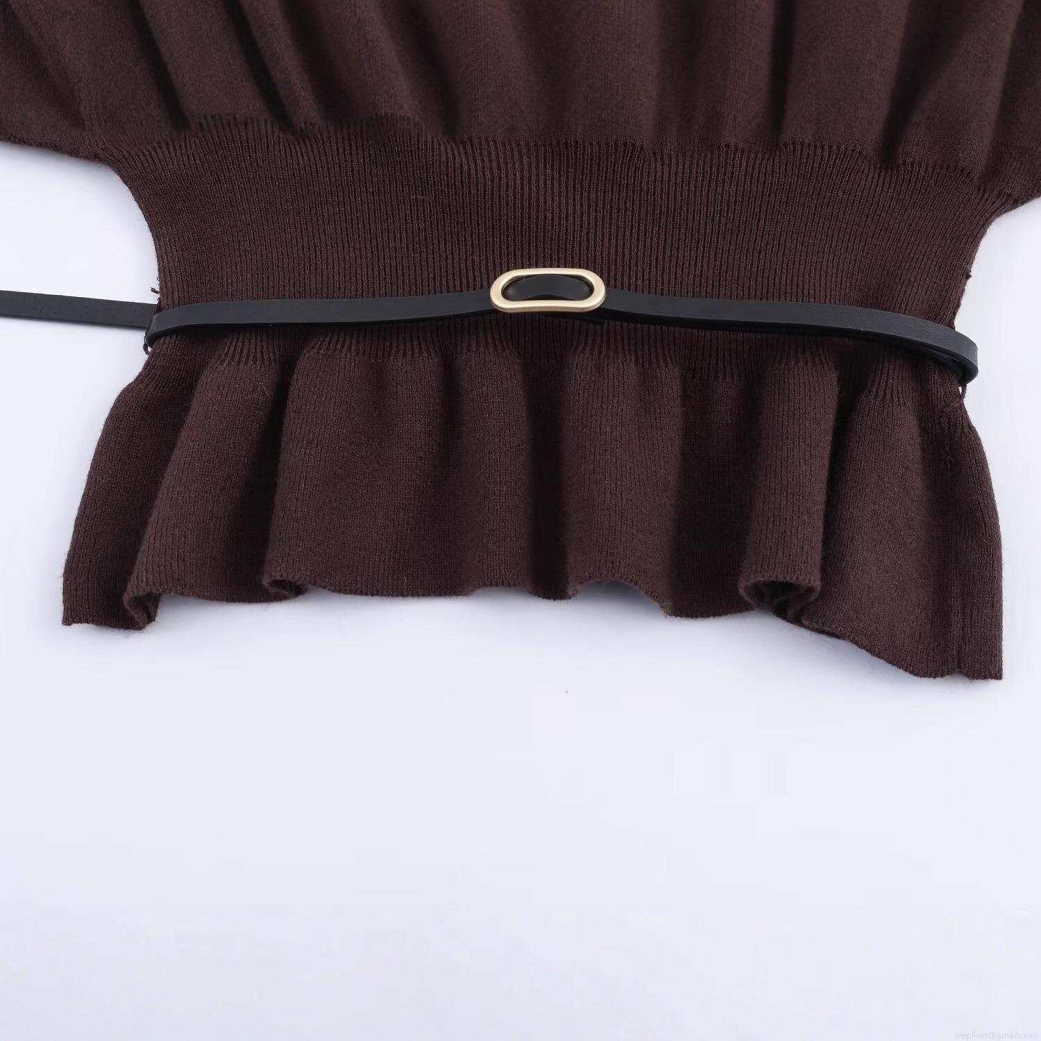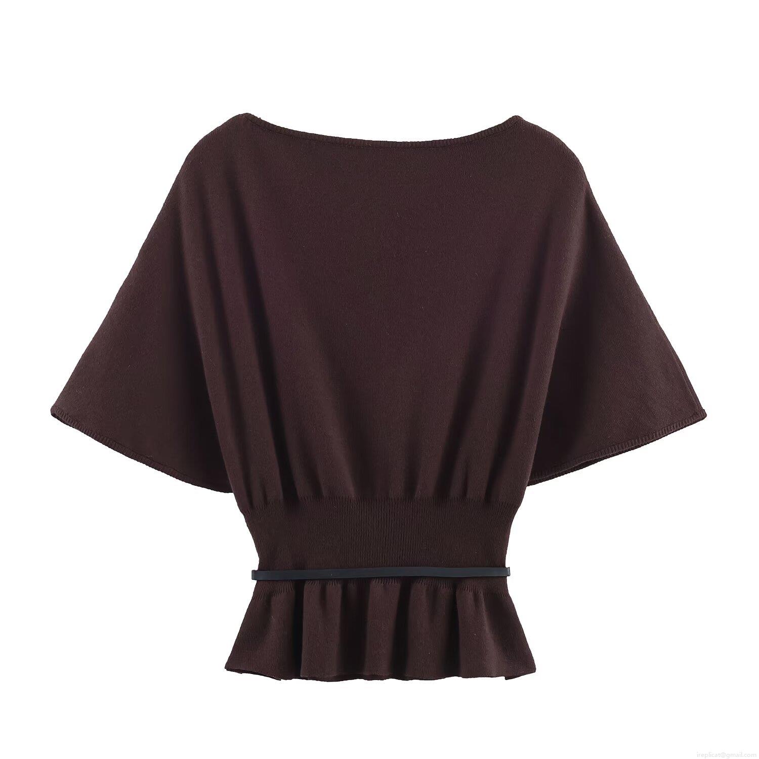 Women's Western Style Knit T-Shirt Elegant Batwing Sleeve Slim Fit Pullover Top With Belt Casual Solid Coffee Brown Peplum Blouse For Women Streetwear Fashion