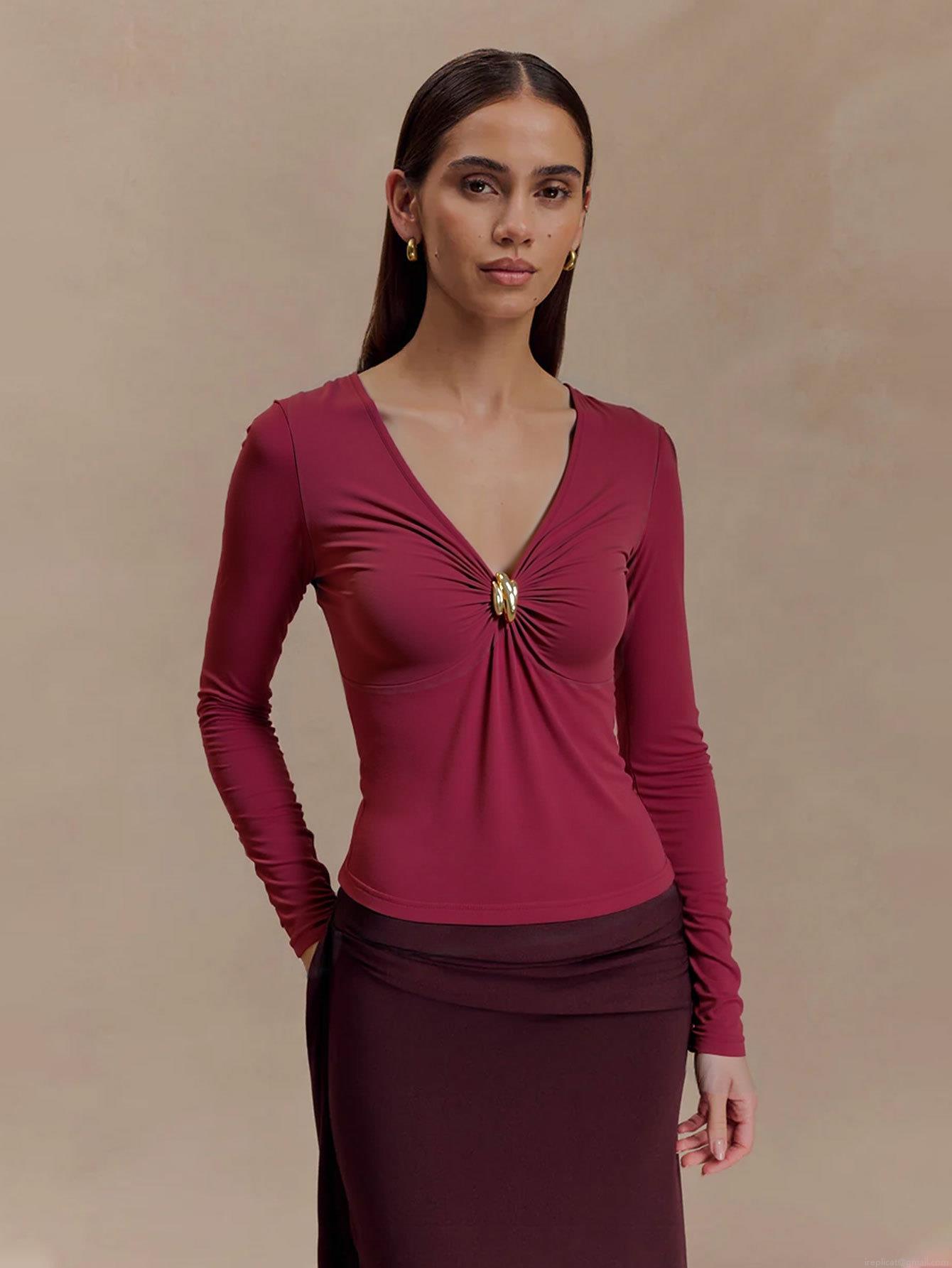 • Women's Wine Red V-Neck Long Sleeve T-Shirt Elegant Slim Fit Top With Gold Metal Ring Pleated Detail Polyester Elastane Sexy Pullover For Autumn Daily Wear