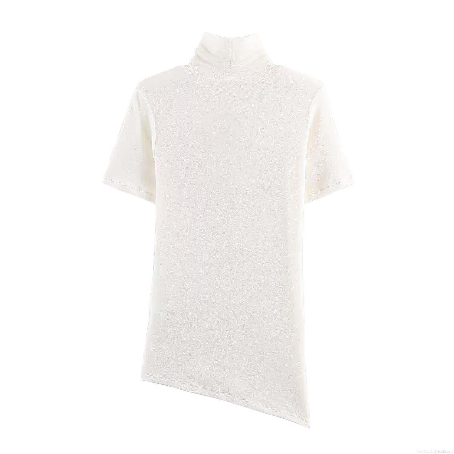 • Women's Winter Fashion Casual High Neck Short Sleeve Knit T-Shirt Solid Color Loose Fit Top With Asymmetrical Hem Spandex Blend Tee For Daily Wear