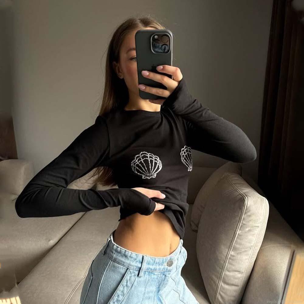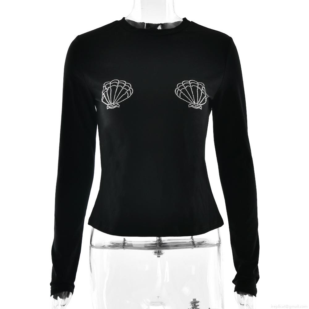 • Women's Y2K Long Sleeve T-Shirt Rhinestone Shell Decoration Slim Fit Round Neck Polyester Cotton Blend Streetwear Sexy Tee Top