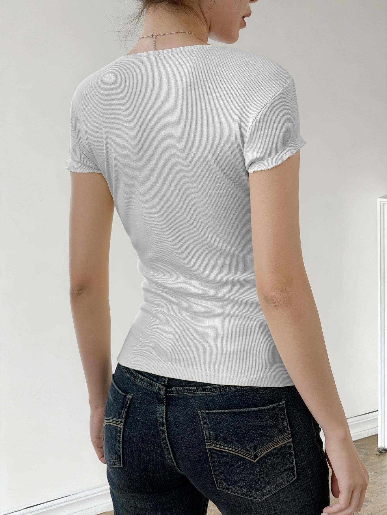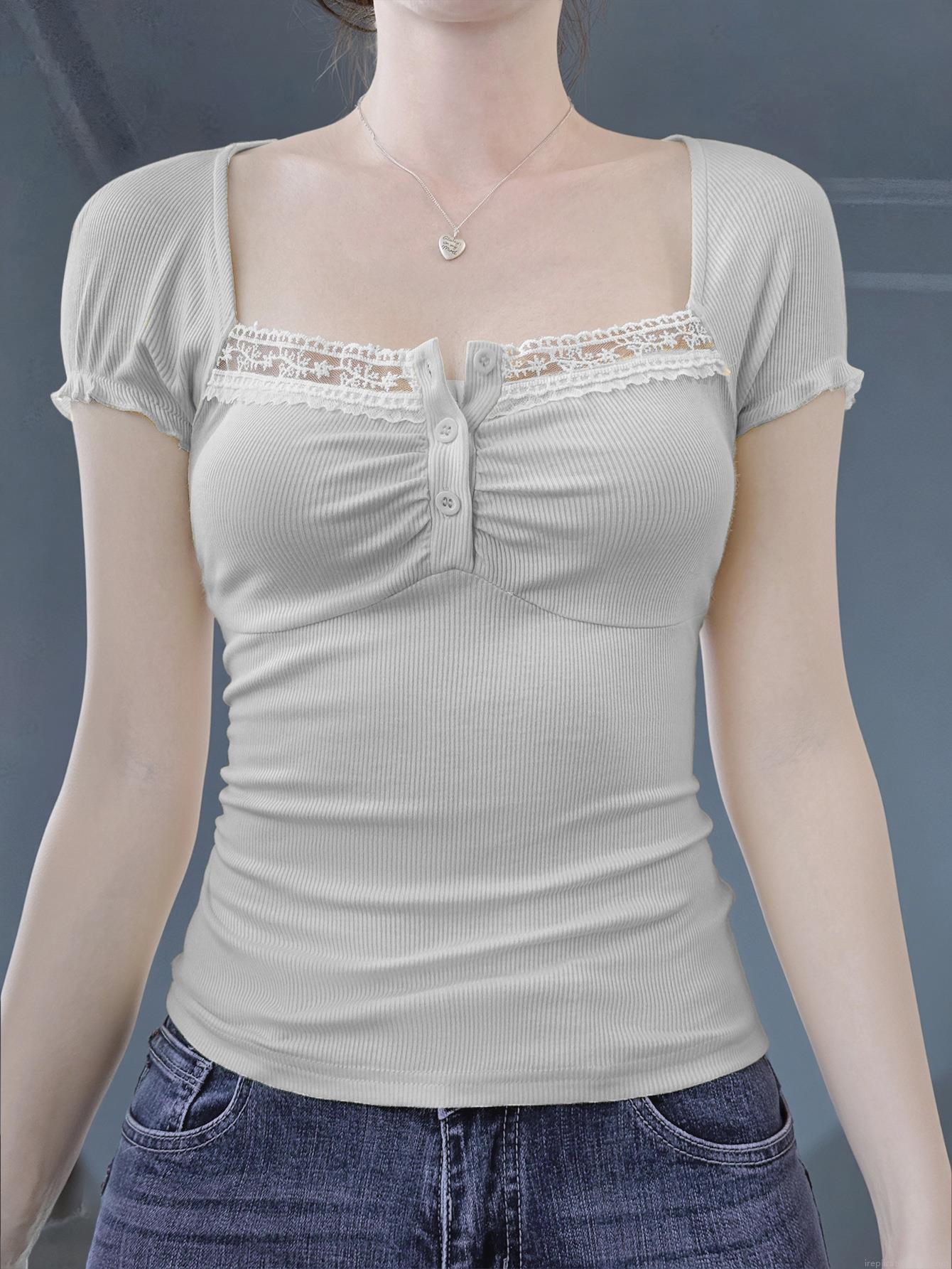 • Women's Y2K Sexy Hot Girl Style T-Shirt Square Neck Lace Trim Button Decor Ribbed Knit Short Sleeve Slim Fit Top Viscose Elastane Women Clothing