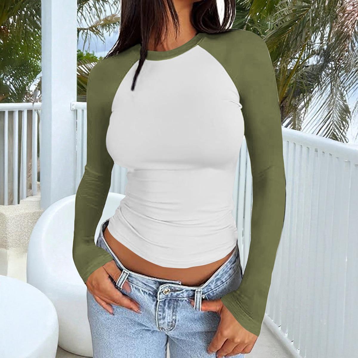 • Women's Y2K Sexy Slim Fit Raglan Long Sleeve T-Shirt Round Neck Contrast Color Viscose Elastane Top for Daily Streetwear Fashion