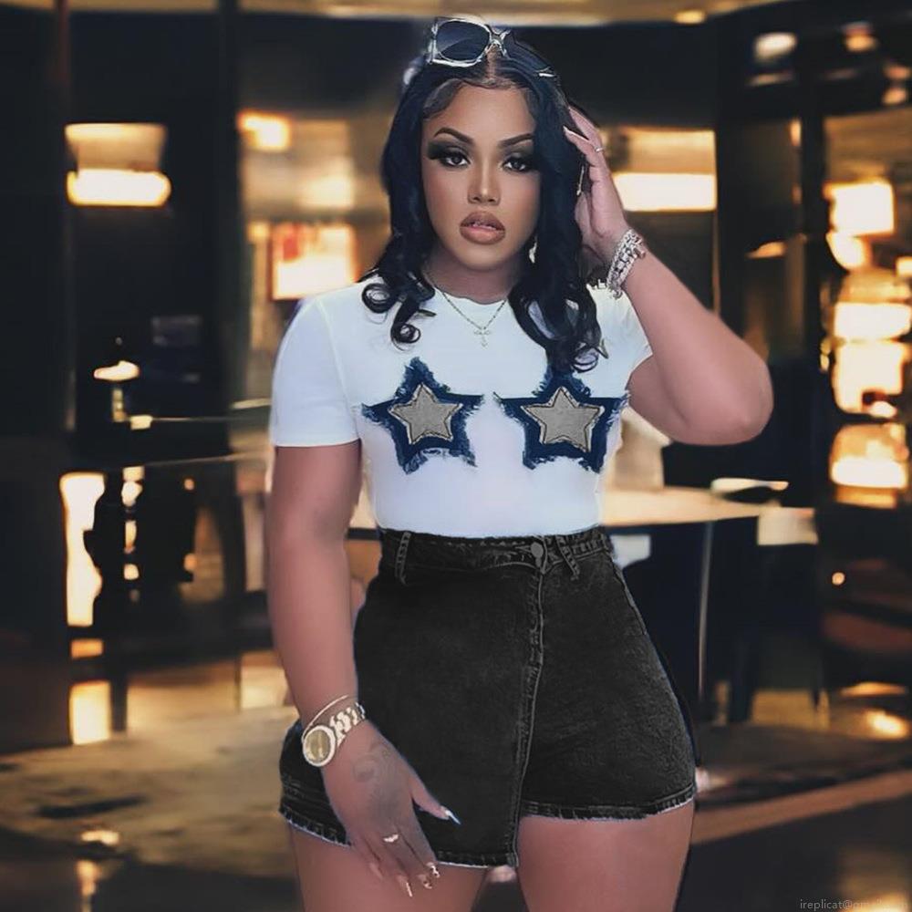 • Women's Y2K Streetwear White Crop Top T-Shirt With Denim Star Patch Fringed Patchwork Round Neck Short Sleeve Slim Fit Summer Street Fashion Tee