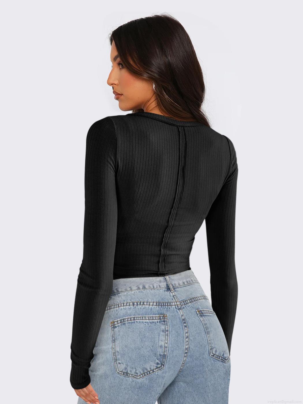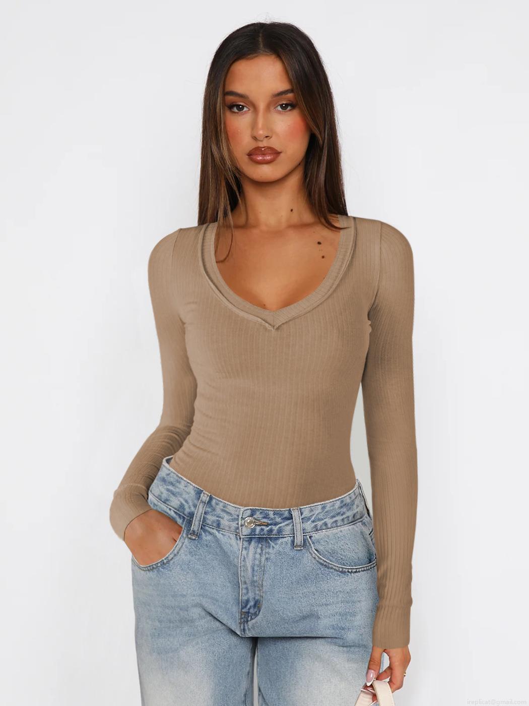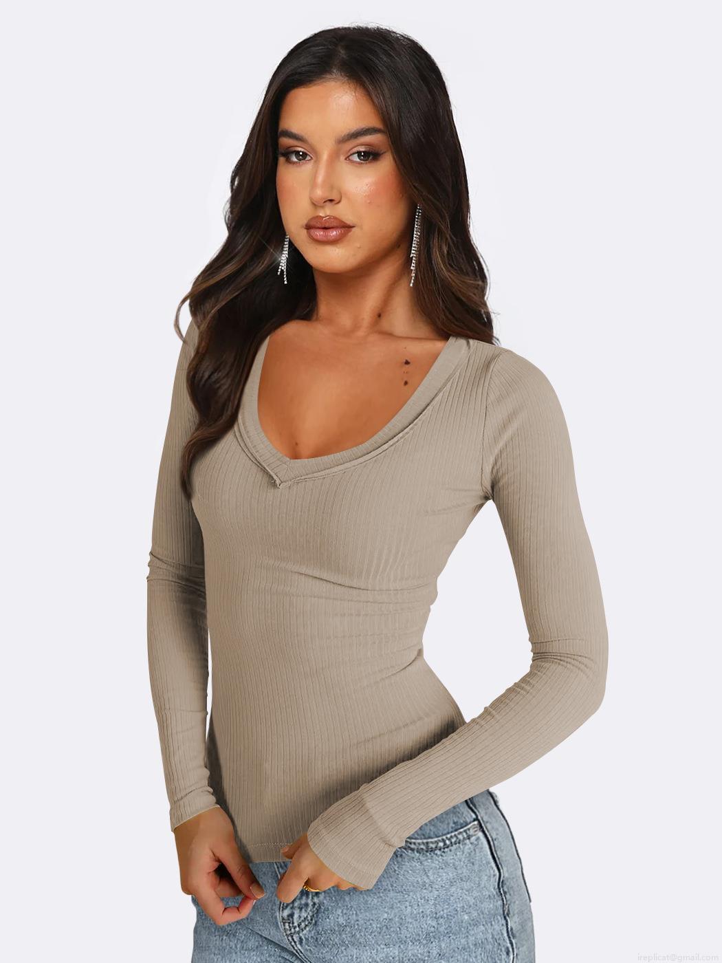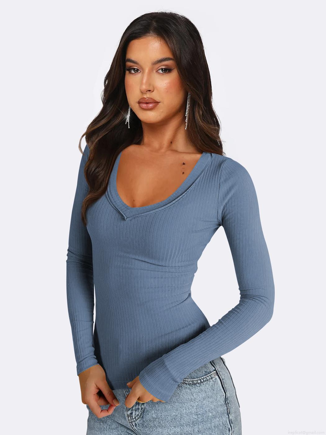 • Y2K Women's Sexy V-Neck Long Sleeve Polyester Spandex Ribbed Knit T-Shirt Slim Fit Solid Color Basic Base Layer Top Women Fashion Casual Pullover