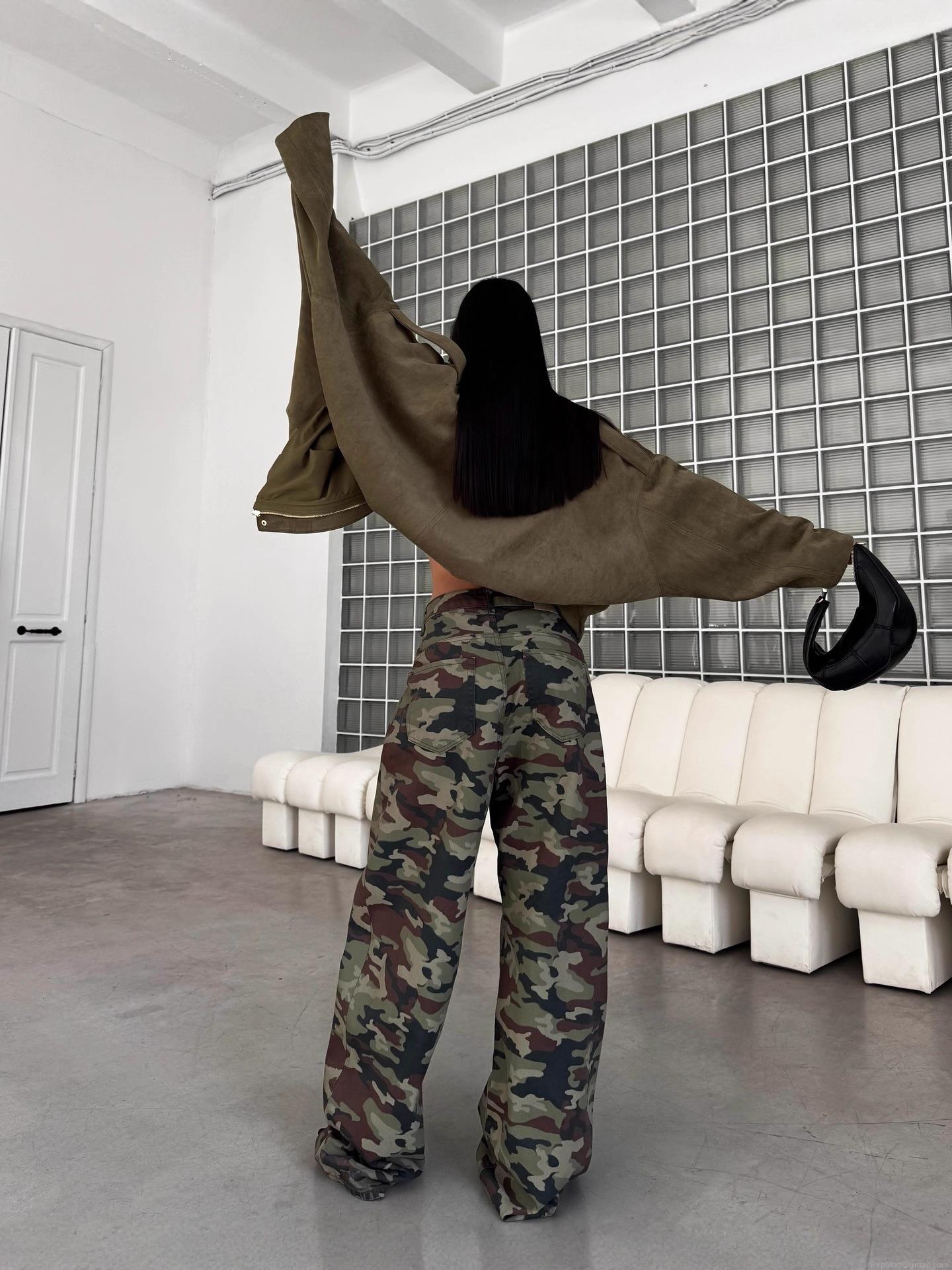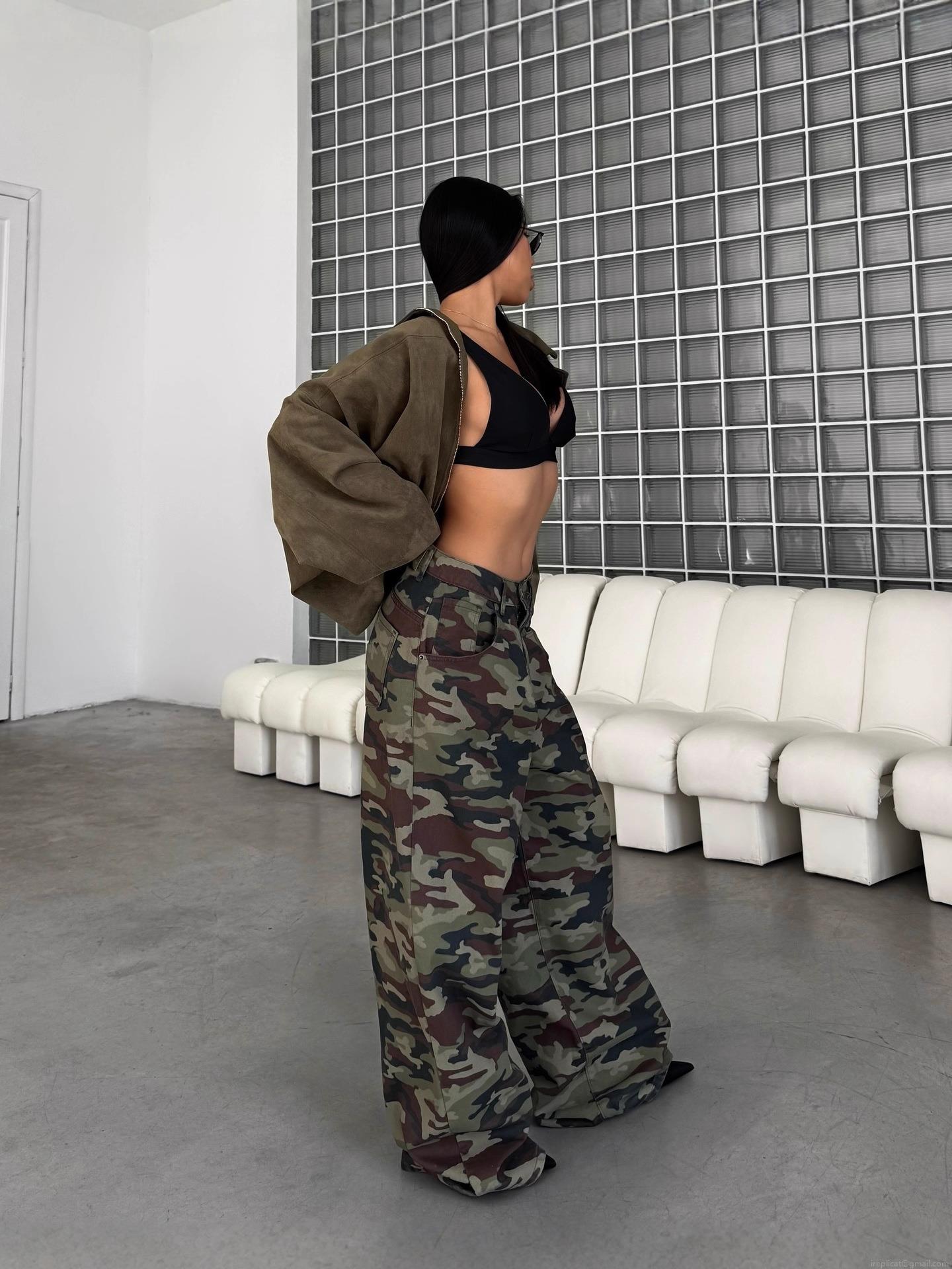 Women's Vintage Camouflage Low Waist Cargo Pants Baggy Straight Wide Leg Cotton Denim Streetwear Trousers High Street Retro Multi-Pocket Jeans