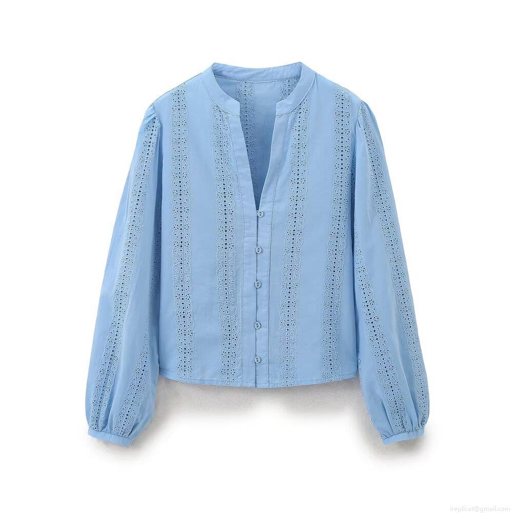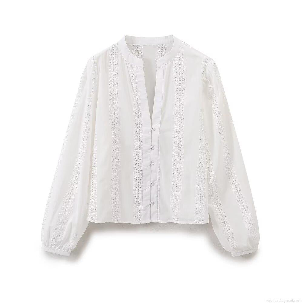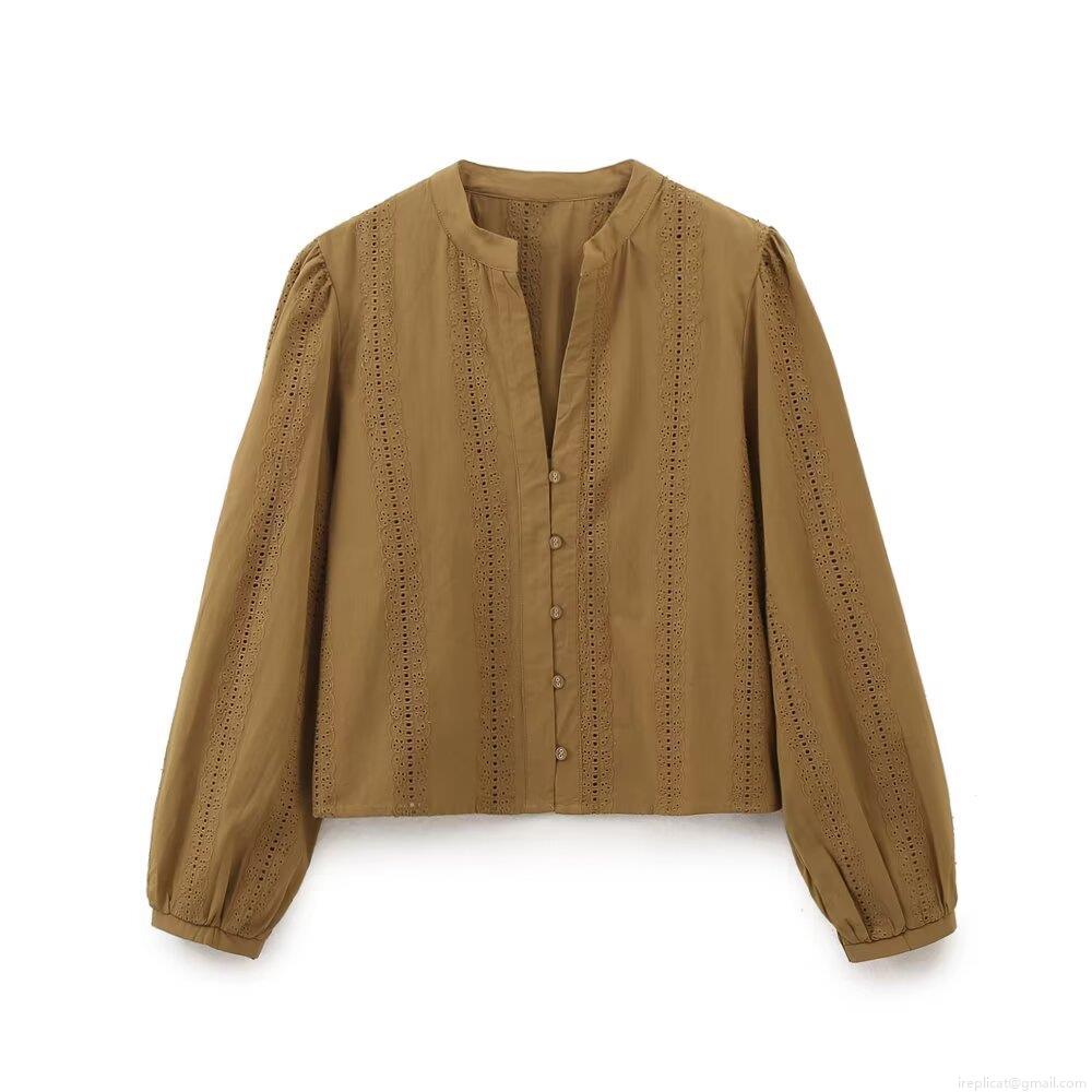 • Women's Vintage Cotton Blend Embroidered Eyelet Blouse V Neck Lantern Long Sleeve Button Down Shirt Top Solid Color Casual Streetwear Top for Women