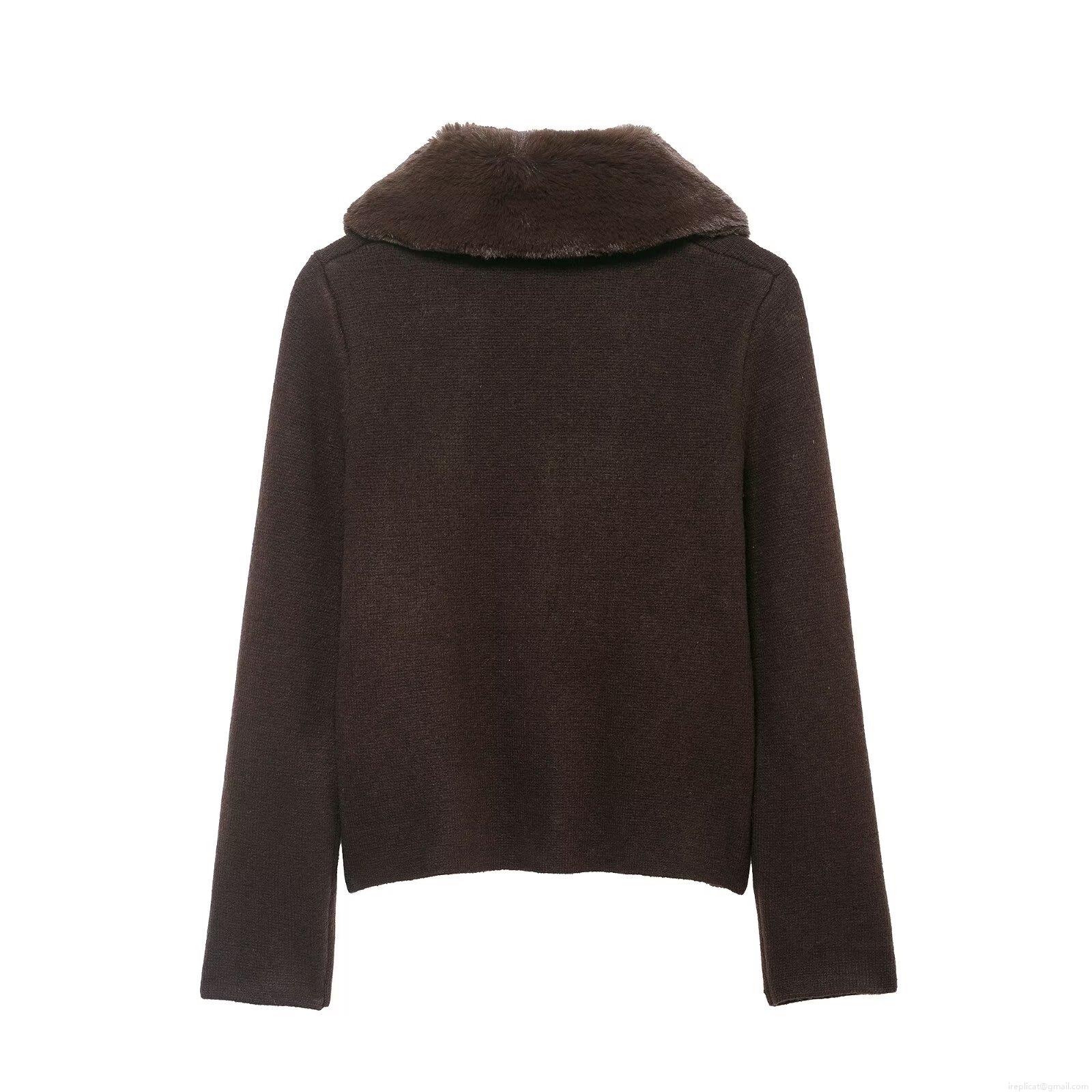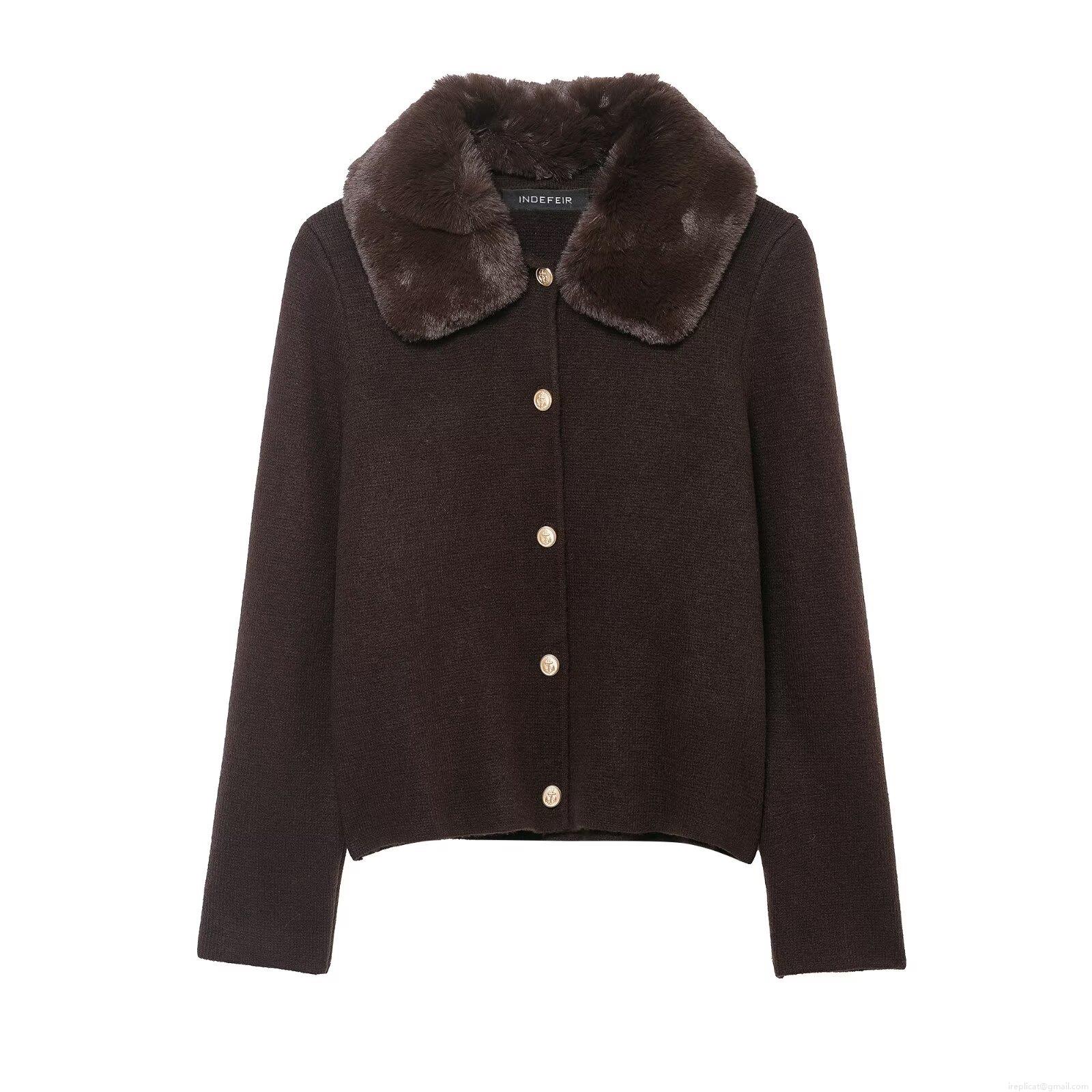 • Women's Vintage Fall Winter Knit Jacket With Faux Fur Collar Gold Embossed Buttons Long Sleeve Solid Color Warm Loose Outerwear Coffee Cardigan