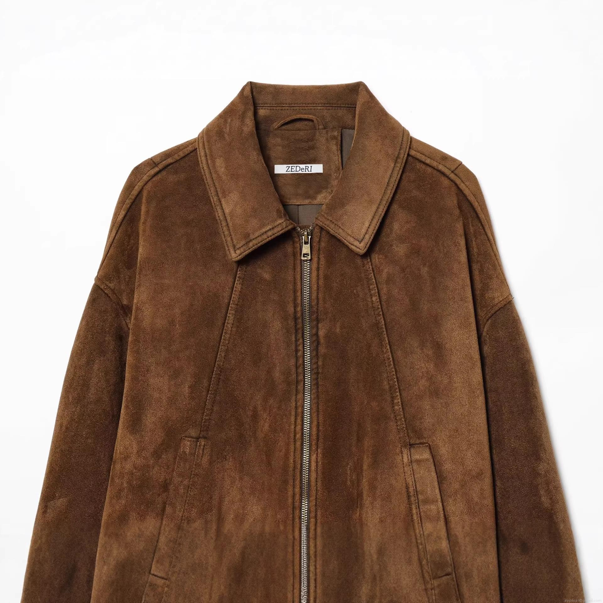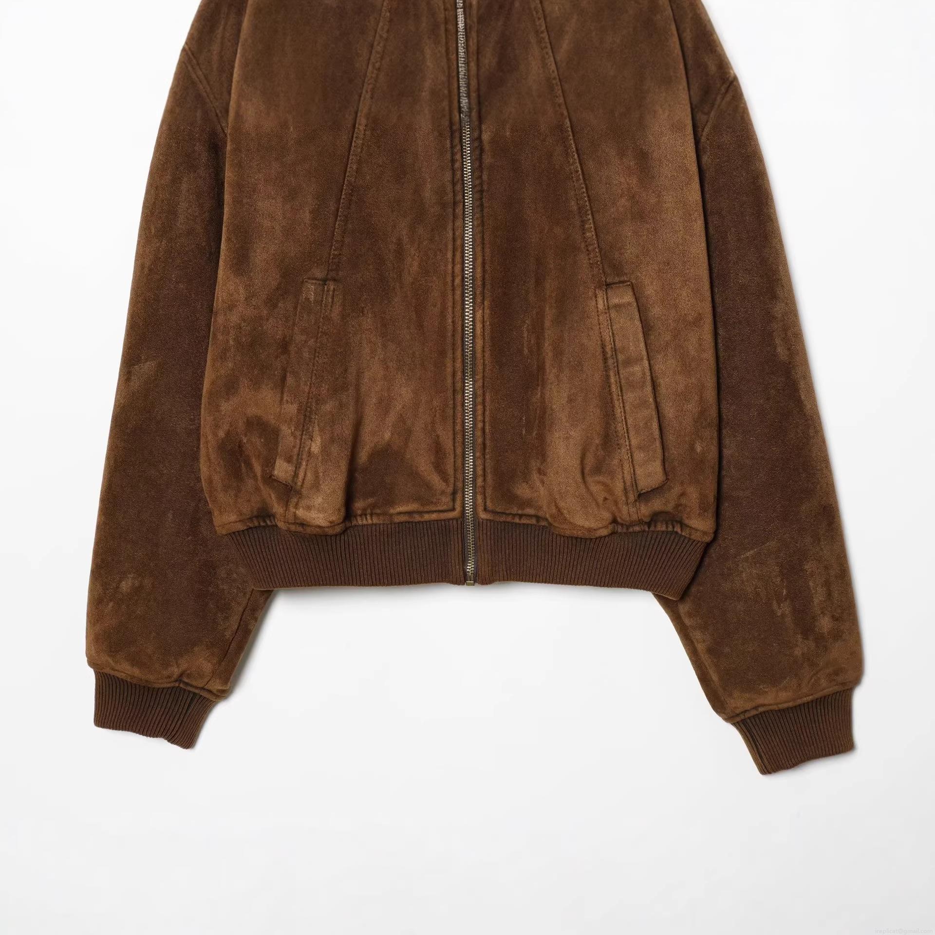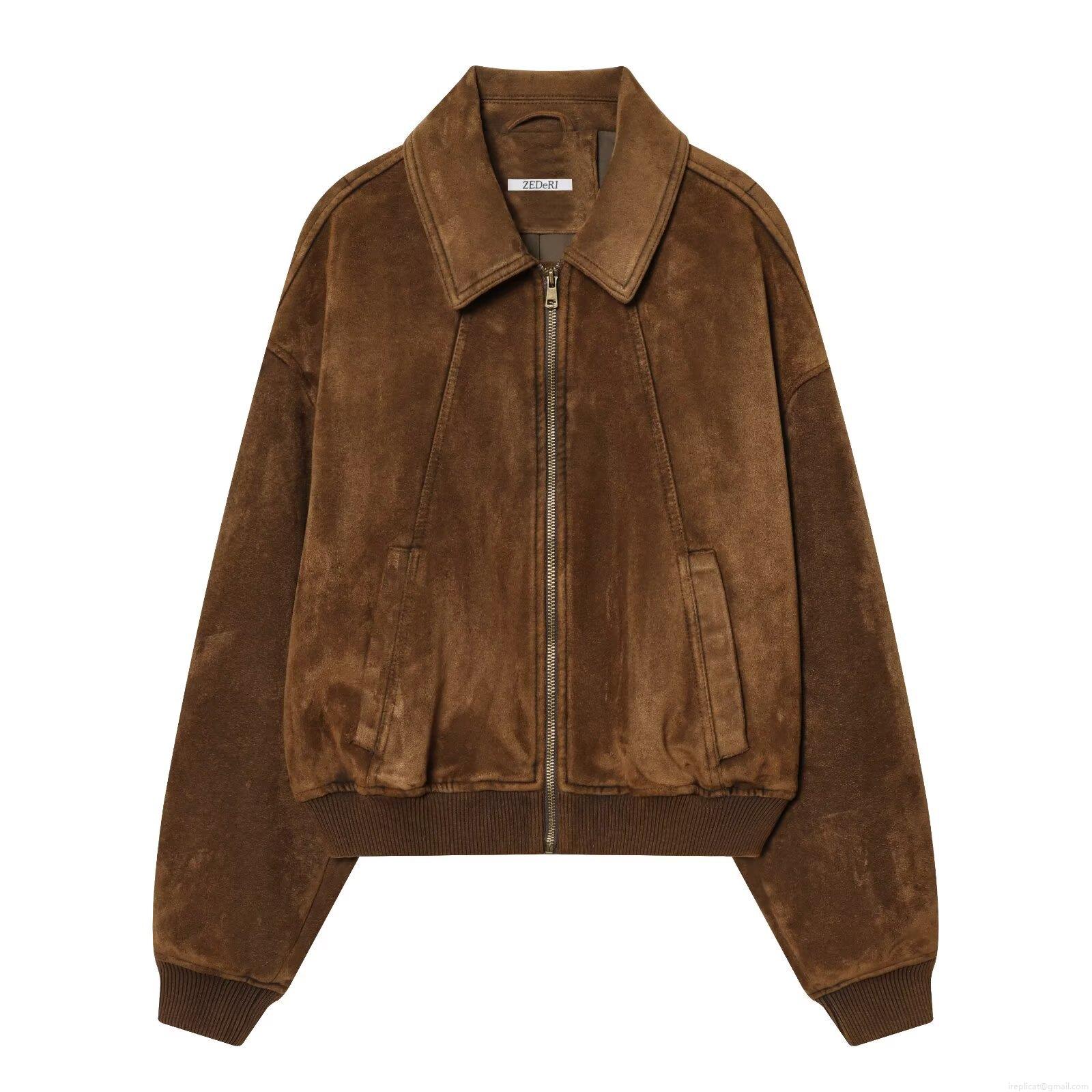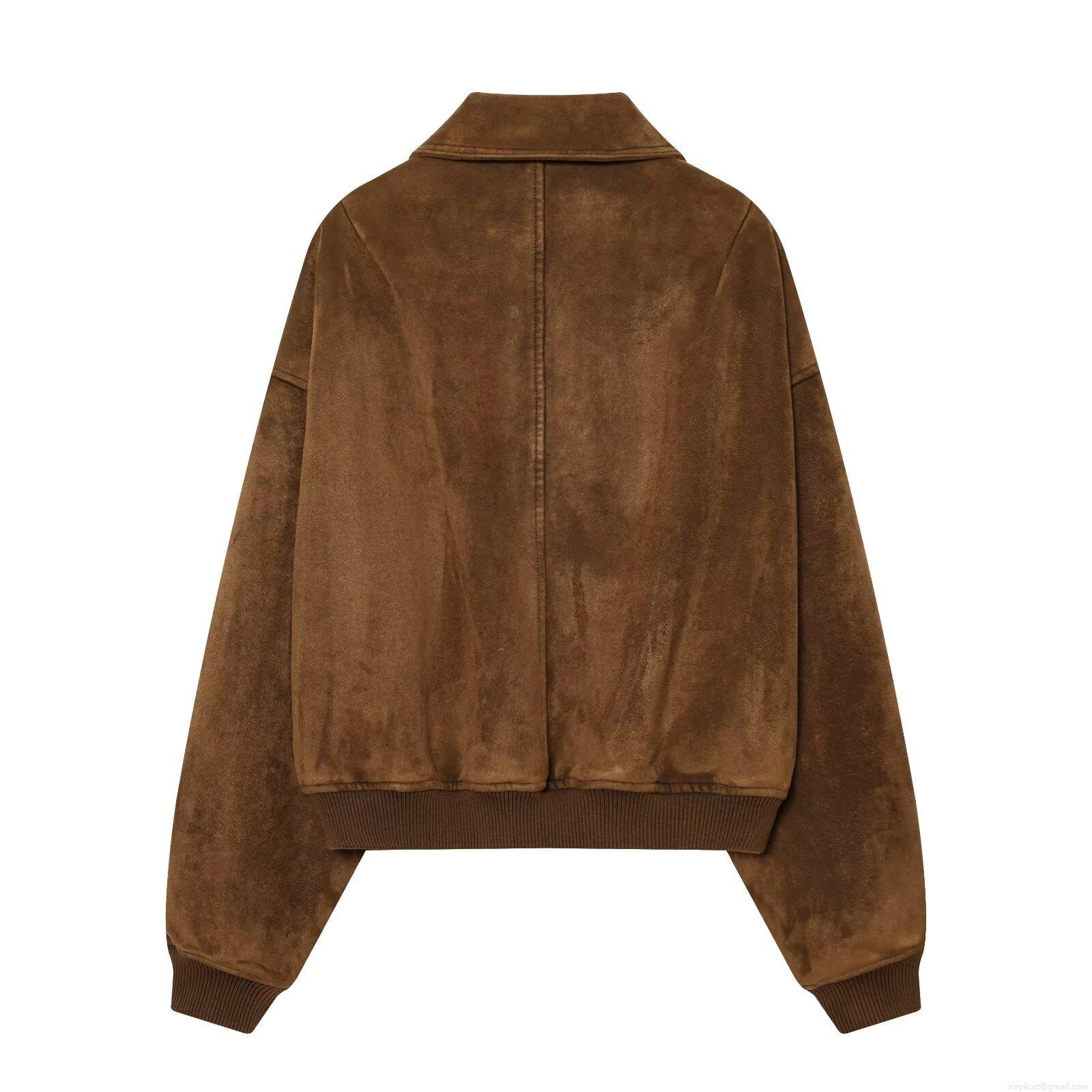 • Women's Vintage Suede Bomber Jacket Solid Color Polyester Zipper Lapel Coat With Pockets Casual Streetwear Outerwear For Autumn Winter