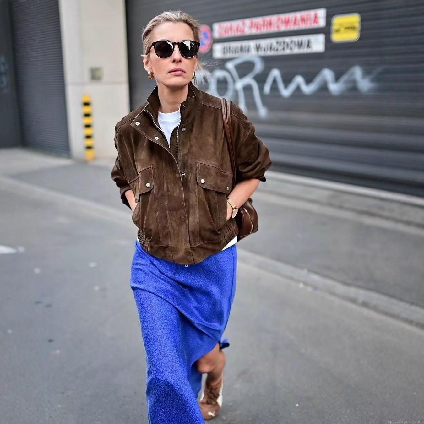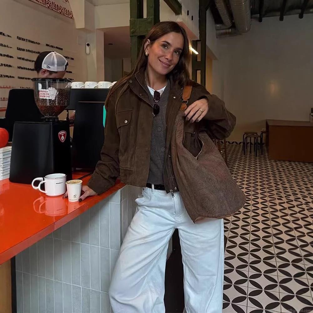 • Women's Vintage Suede Jacket Coat Loose Fit Stand Collar Zip Up Outerwear Long Sleeve Pocket Casual Street Fashion Women Spring Autumn