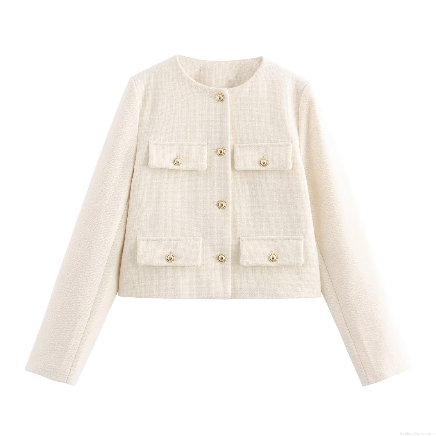 • Women's Vintage Tweed Jacket Elegant Short Round Neck Coat With Gold Buttons Four Pockets Solid Color Long Sleeve Outerwear For Office Party