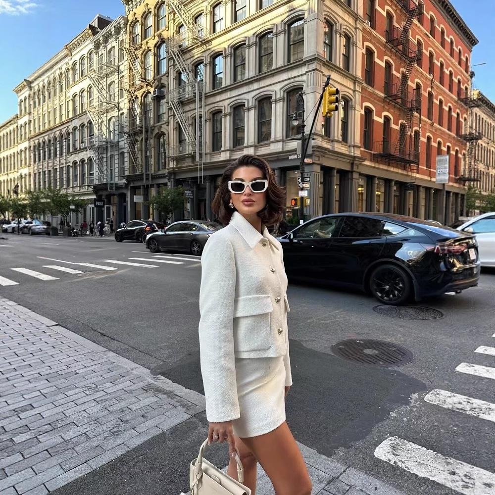 • Women's Vintage White Tweed Short Jacket Elegant Lapel Long Sleeve Cardigan With Gold Buttons Commuter Solid Color Woven Outerwear Top