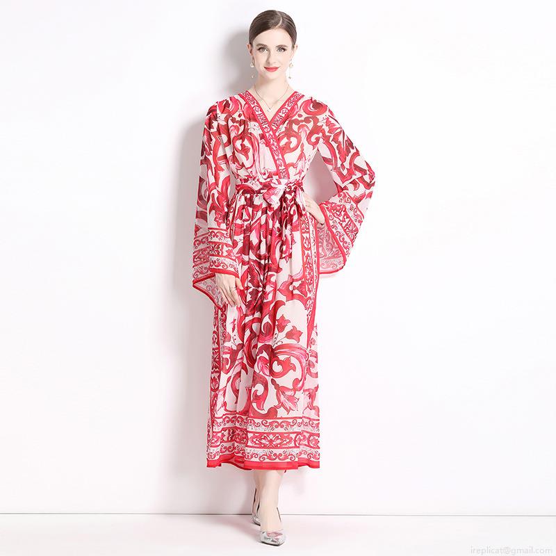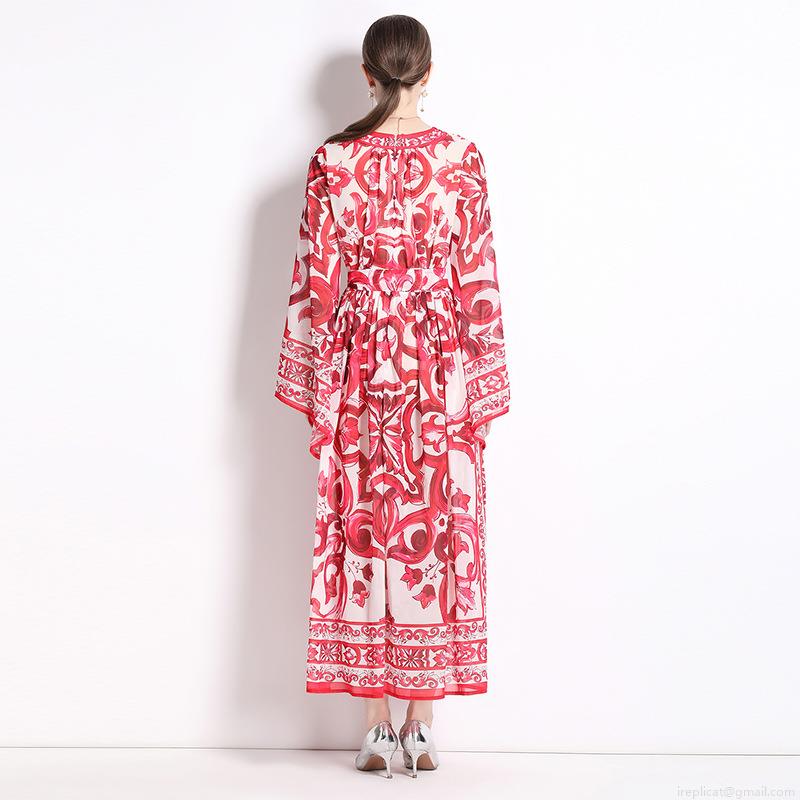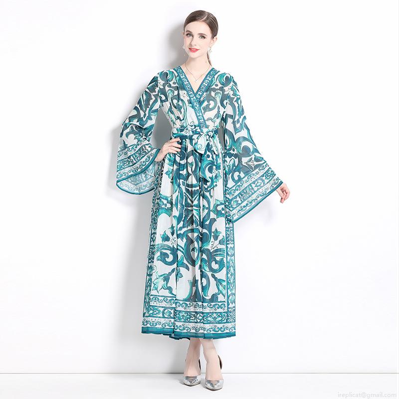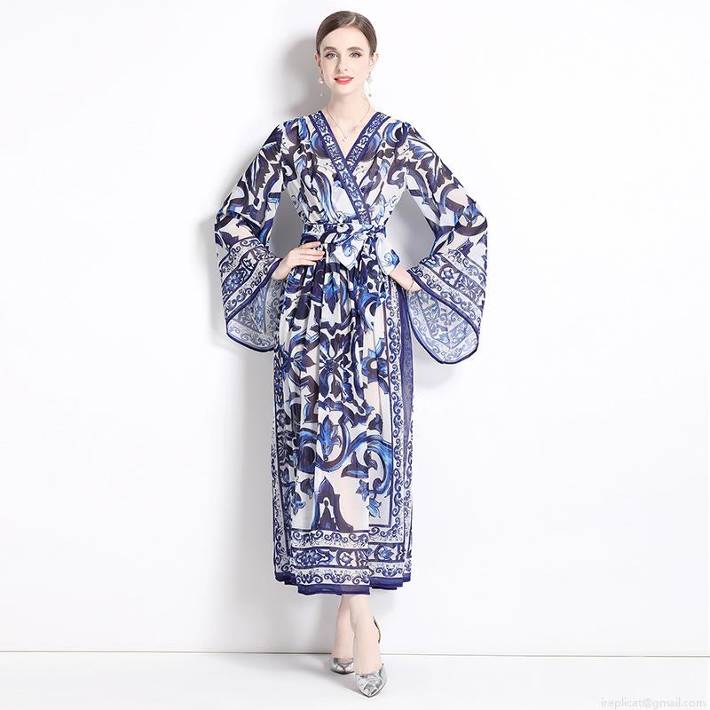 Bow, Flower, Printing, Lace, Big Swing, Batwing Sleeves, Baroque Patterns, Blue And White Porcelain Printed