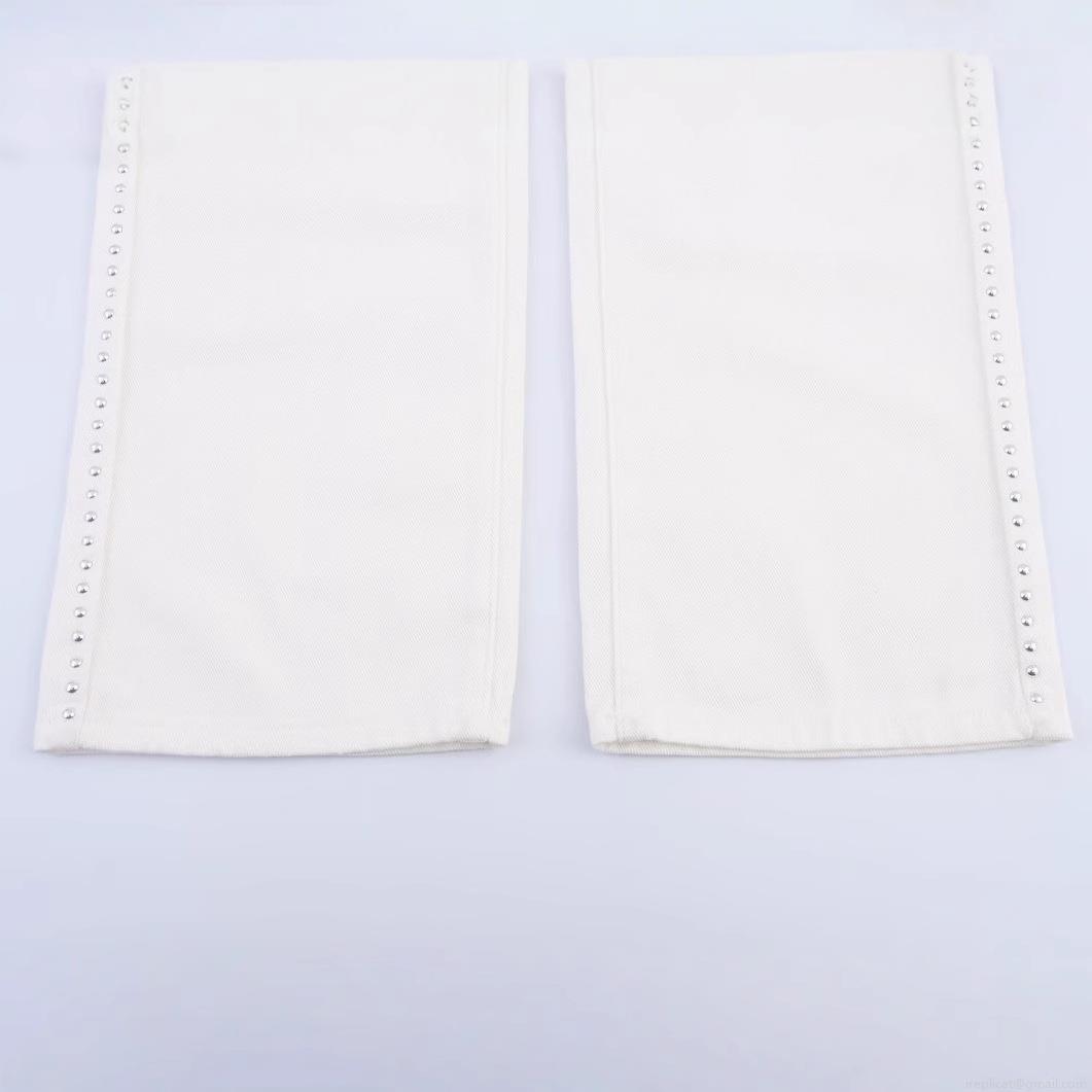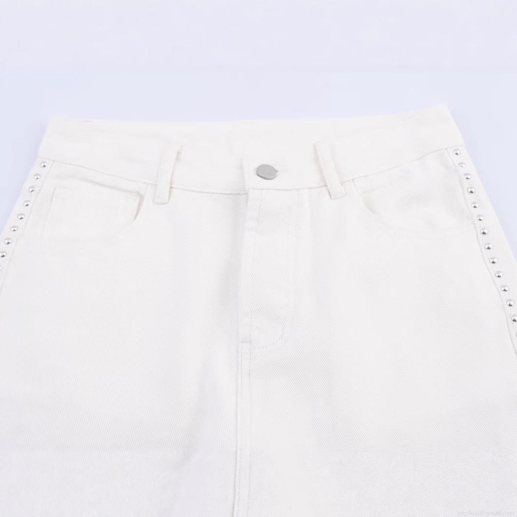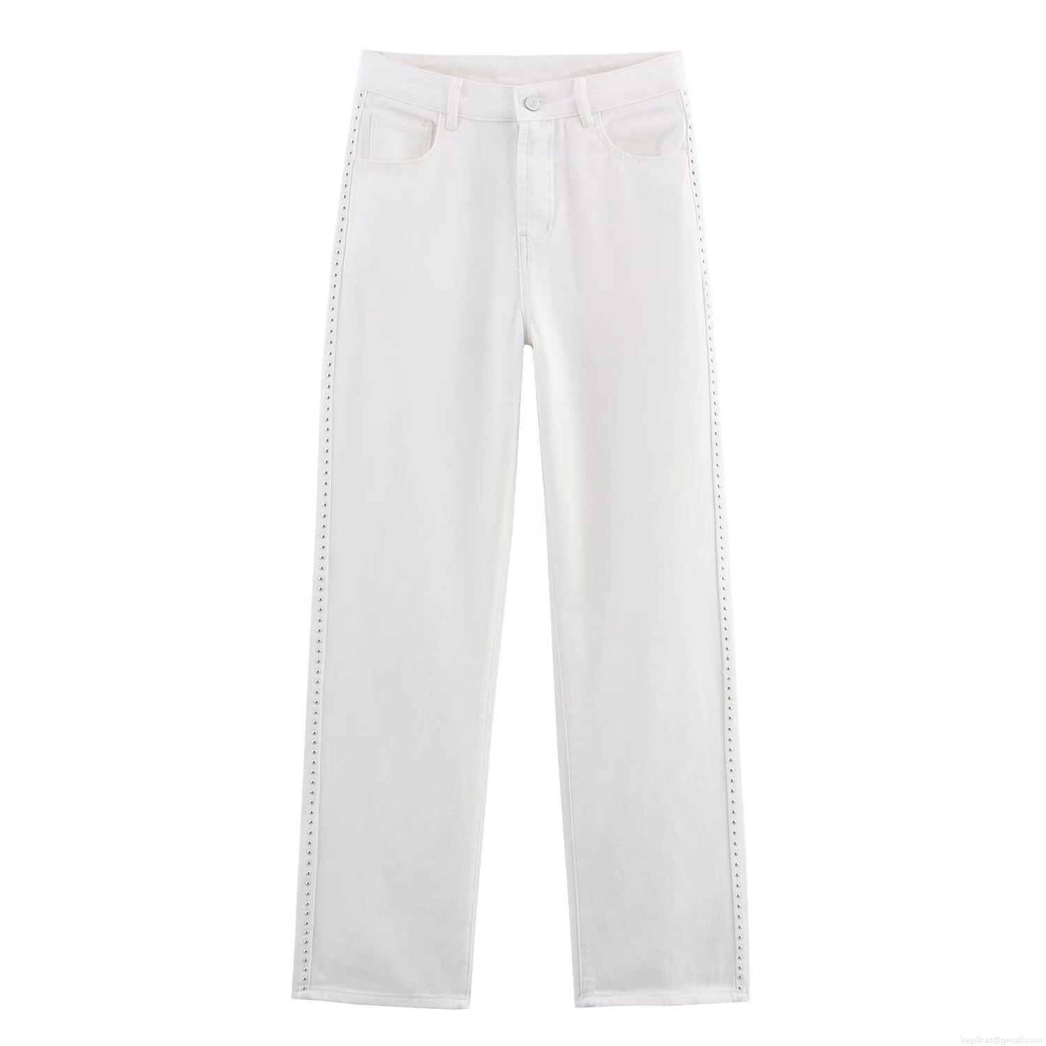 Women's White Studded Straight Leg Jeans Denim Rivet Trimmed High Waist Casual Streetwear Pants For Women
